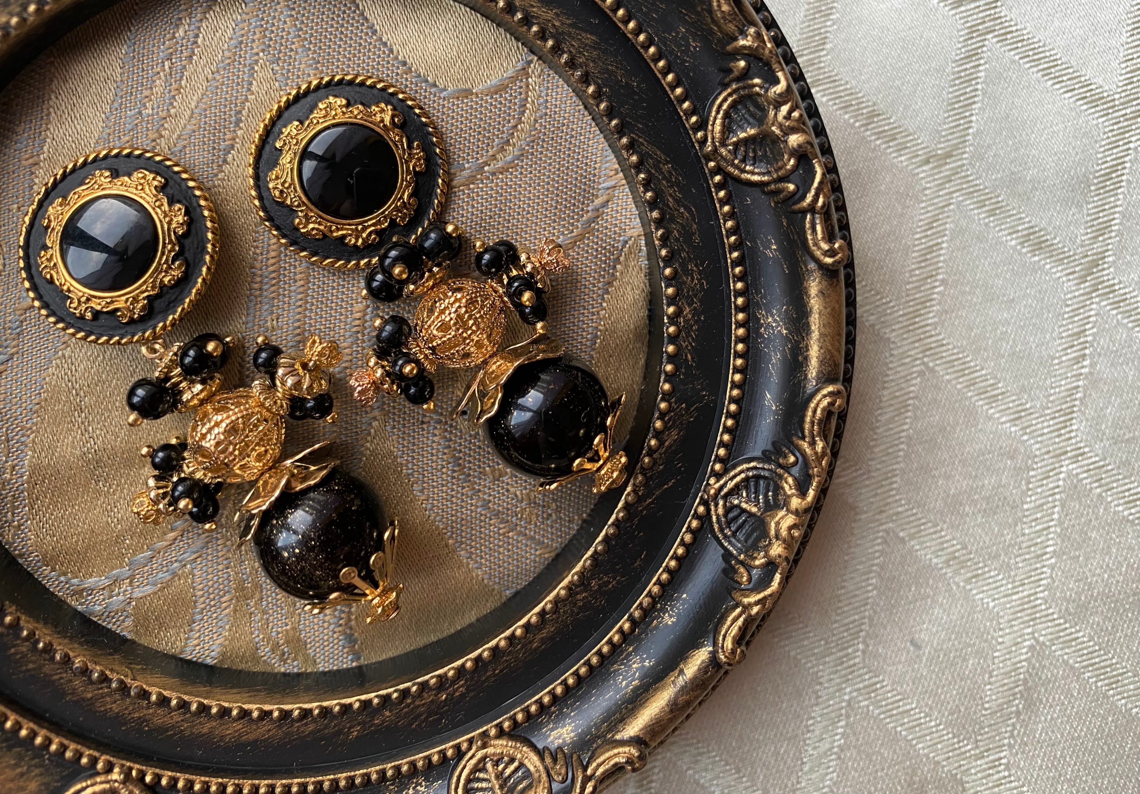 ブラック×メタルパーツを組み合わせたイヤーアクセサリーは、十字架を模したデザインにも見えます。 装飾的なメタルパーツを合わせてボリューム感のある存在感抜群のイヤーアクセサリーに。ボタンから下のモチーフ全体が揺れ、小粒なデッドストックビースが揺れ、耳元をデコラティブに彩ります。 ※イヤー金具は特に指定がない場合はチタンピアスをお付けしてお送りいたします。イヤリング金具をご希望の方は【備考欄】にイヤリング希望とご記入ください。 材質:ガラスパーツ(デッドストック)、プラビーズ(デッドストック)、合金、CCBパーツ、チタン(ピアスポスト部分) サイズ:約4.9×2cm 【購入時の注意点】 ・ノークレームノーリターンでお願い致します。 ・丁寧にお作りしておりますがハンドメイドの特性上、個体差があります。 ・ヴィンテージパーツは一点一点個体差がございますので、完璧なものをお求めになる方はご購入をお控えください。 ・あくまでもハンドメイドですので、既製品のような強度はございませんので、予めご了承ください。もし使用中に破損などが生じた場合、修理も承っております。CONTACTからご相談ください。 ・お使いの端末などにより、写真と実物の色味や質感が多少異なって見えることがあります。 ・スマホやパソコンの色味設定(ナイトモードなど)を変えている場合は、写真と実物の色味が多少異なって見えることがあります。 ・実際の色味に近づけて撮影していますが、撮影する場所(屋内や屋外)により色味が微妙に異なって見えることがあります。 ・作品の雰囲気を重視して撮影した写真もございます。 その場合は、雰囲気を重視した写真となるべく実物の色味に見えるように撮影した写真の両方を掲載するように努めております。商品写真を全てご確認の上、ご注文のほどお願いいたします。 ※到着時に不良が生じていた場合はご報告ください。早急に対応させていただきます。 ・金属アレルギーをお持ちの方は、事前に使用パーツの確認をお願いいたします。 ・輸送時の紛失・事故時の責任は負いかねますことを予めご了承ください。