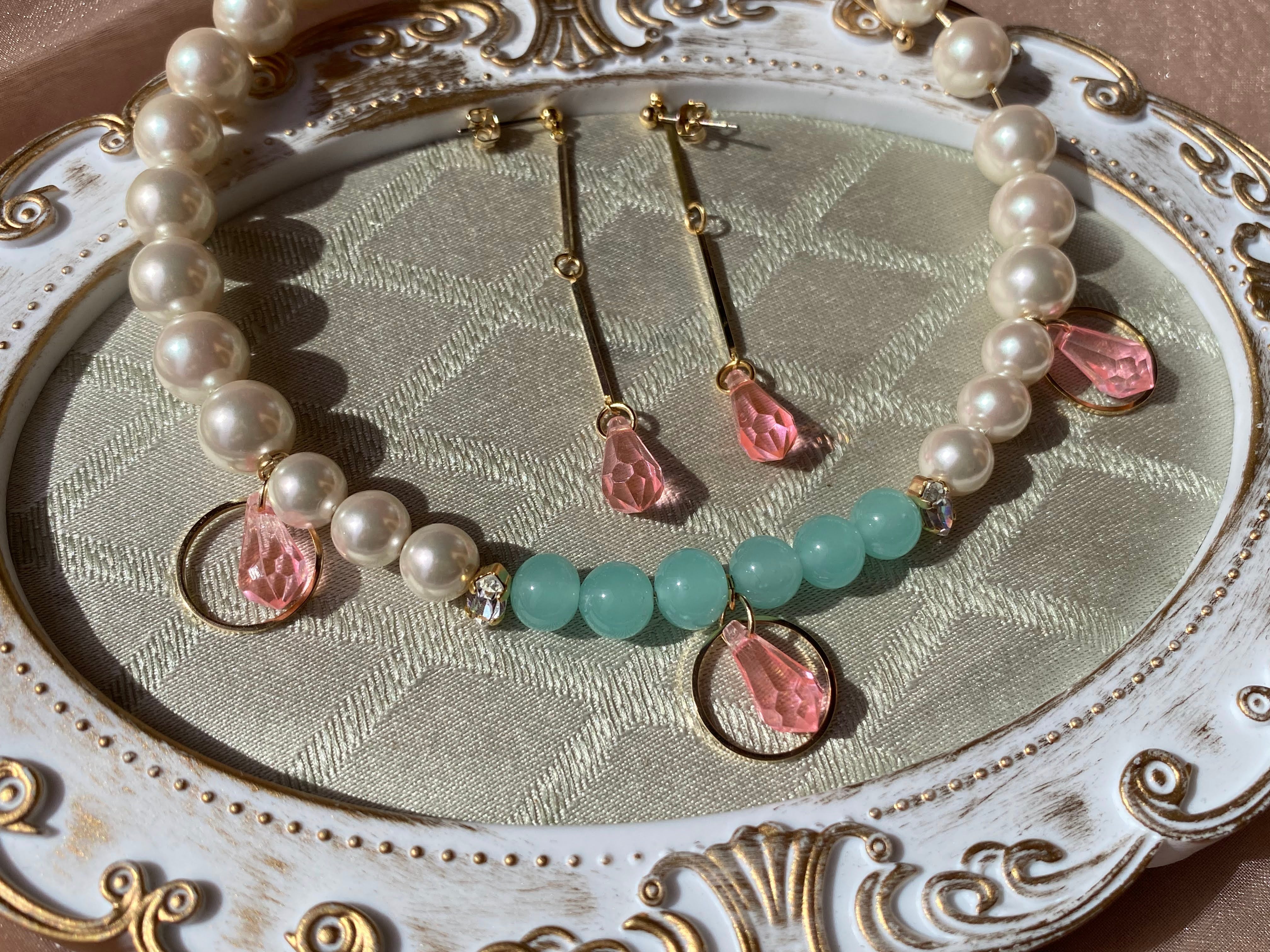 ミントグリーンのガラスビーズ、シルキーパールとピンク色のヴィンテージパーツを組み合わせたチョーカーネックレスです。 発色の良いピンク色のパーツは、アメリカ製のヴィンテージパーツです。 チョーカーには留め具がなく、本体を左右に開くことで簡単に着脱可能です。 セットで組み合わせるのがおすすめのピアスはコチラから(https://nino.official.ec/items/38637369) サイズ:約33㎝ 素材:ウィンテージパーツ、シルキーパール、ガラス、合金 【購入時の注意点】 ・ノークレームノーリターンでお願い致します。 ・丁寧にお作りしておりますがハンドメイドの特性上、個体差があります。 ・ヴィンテージパーツは一点一点個体差がございますので、完璧なものをお求めになる方はご購入をお控えください。 ・あくまでもハンドメイドですので、既製品のような強度はございませんので、予めご了承ください。もし使用中に破損などが生じた場合、修理も承っております。CONTACTからご相談ください。 ・お使いの端末などにより、写真と実物の色味や質感が多少異なって見えることがあります。 ・スマホやパソコンの色味設定(ナイトモードなど)を変えている場合は、写真と実物の色味が多少異なって見えることがあります。 ・実際の色味に近づけて撮影していますが、撮影する場所(屋内や屋外)により色味が微妙に異なって見えることがあります。 ・作品の雰囲気を重視して撮影した写真もございます。 その場合は、雰囲気を重視した写真となるべく実物の色味に見えるように撮影した写真の両方を掲載するように努めております。商品写真を全てご確認の上、ご注文のほどお願いいたします。 ※到着時に不良が生じていた場合はご報告ください。早急に対応させていただきます。 ・金属アレルギーをお持ちの方は、事前に使用パーツの確認をお願いいたします。 ・輸送時の紛失・事故時の責任は負いかねますことを予めご了承ください。