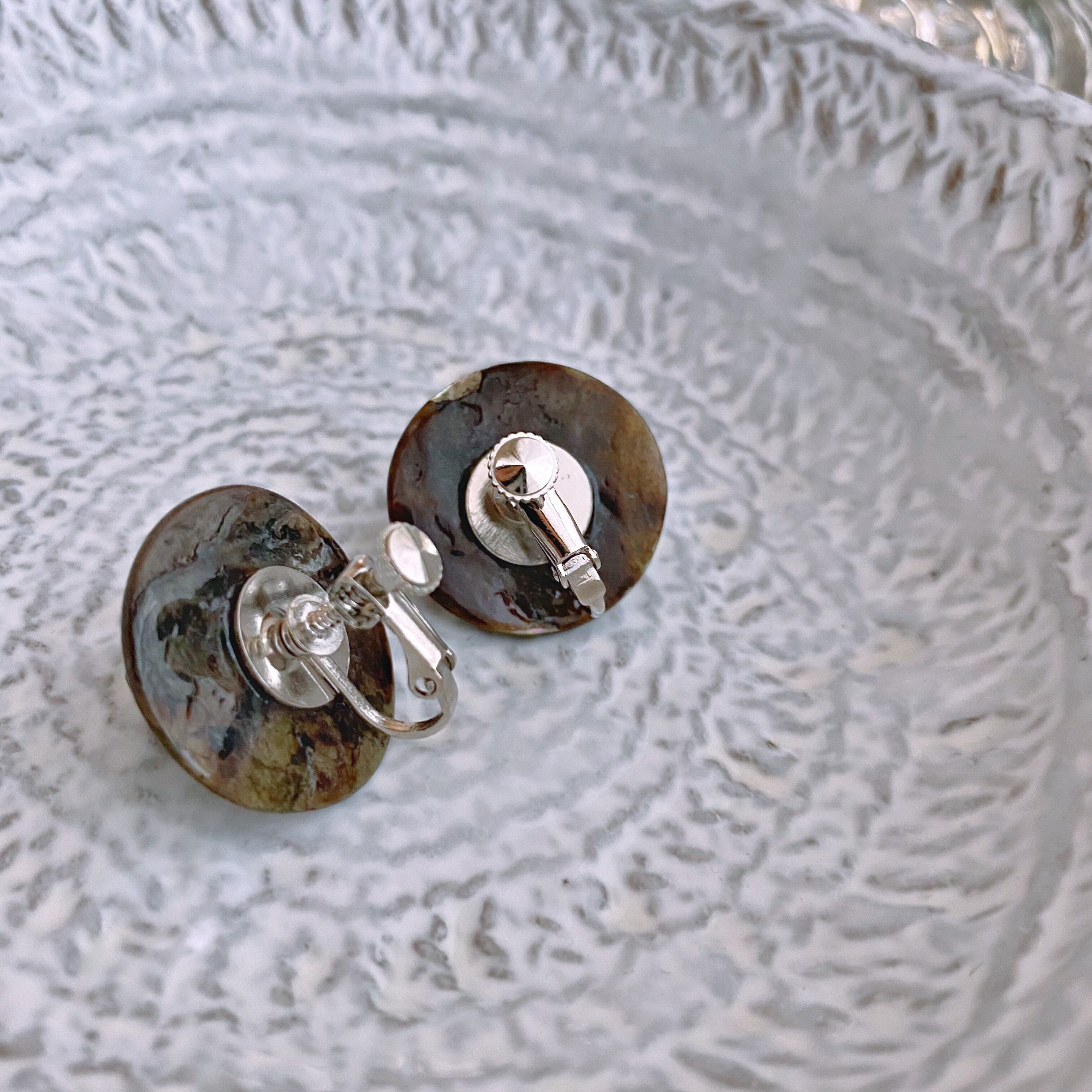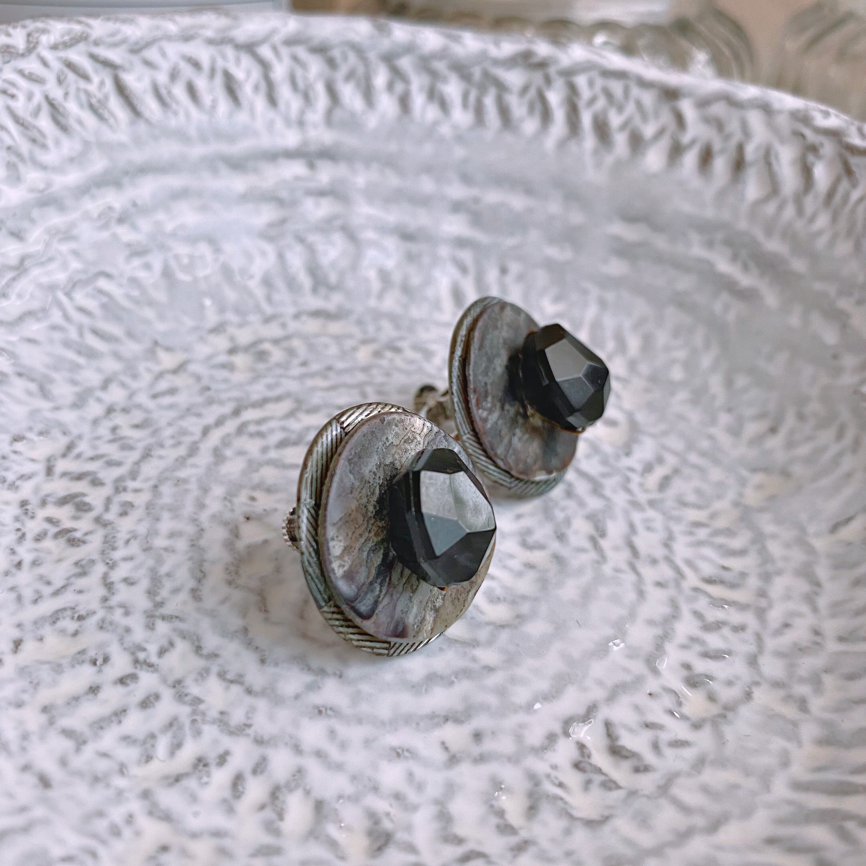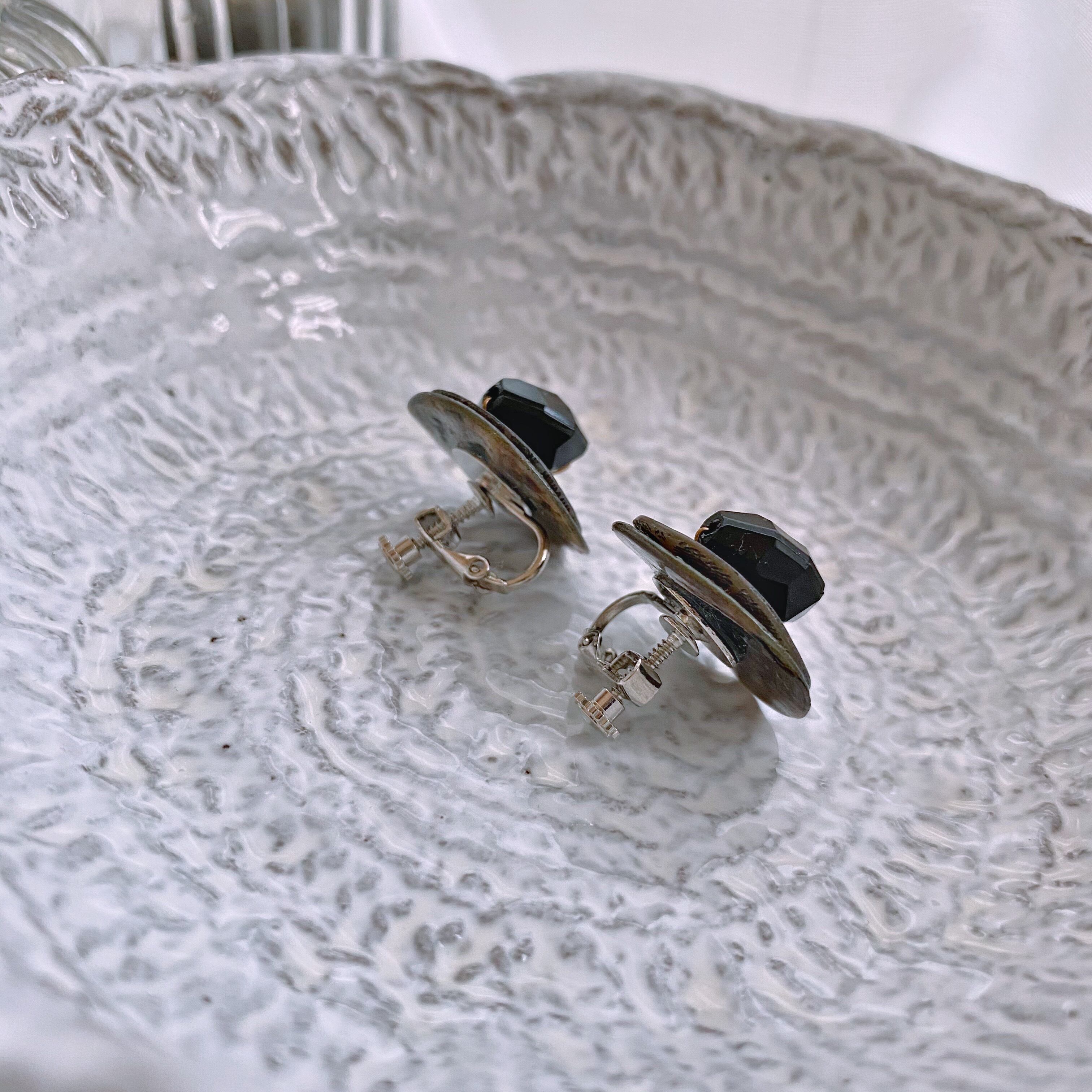 ゴロッとした黒色のビーズをシェルボタンのお皿に配した黒ビーズのローストは、一点もののイヤリングです。