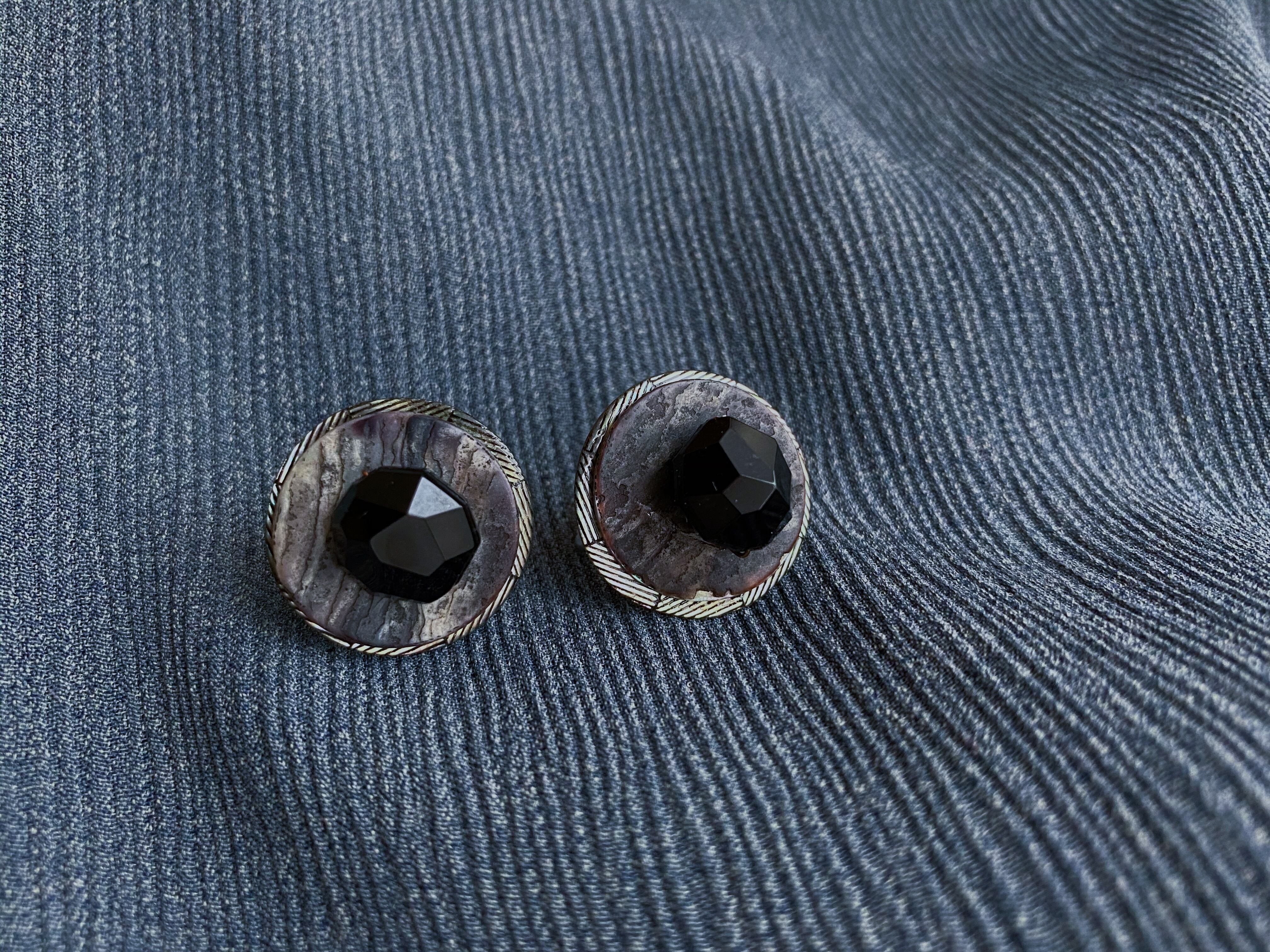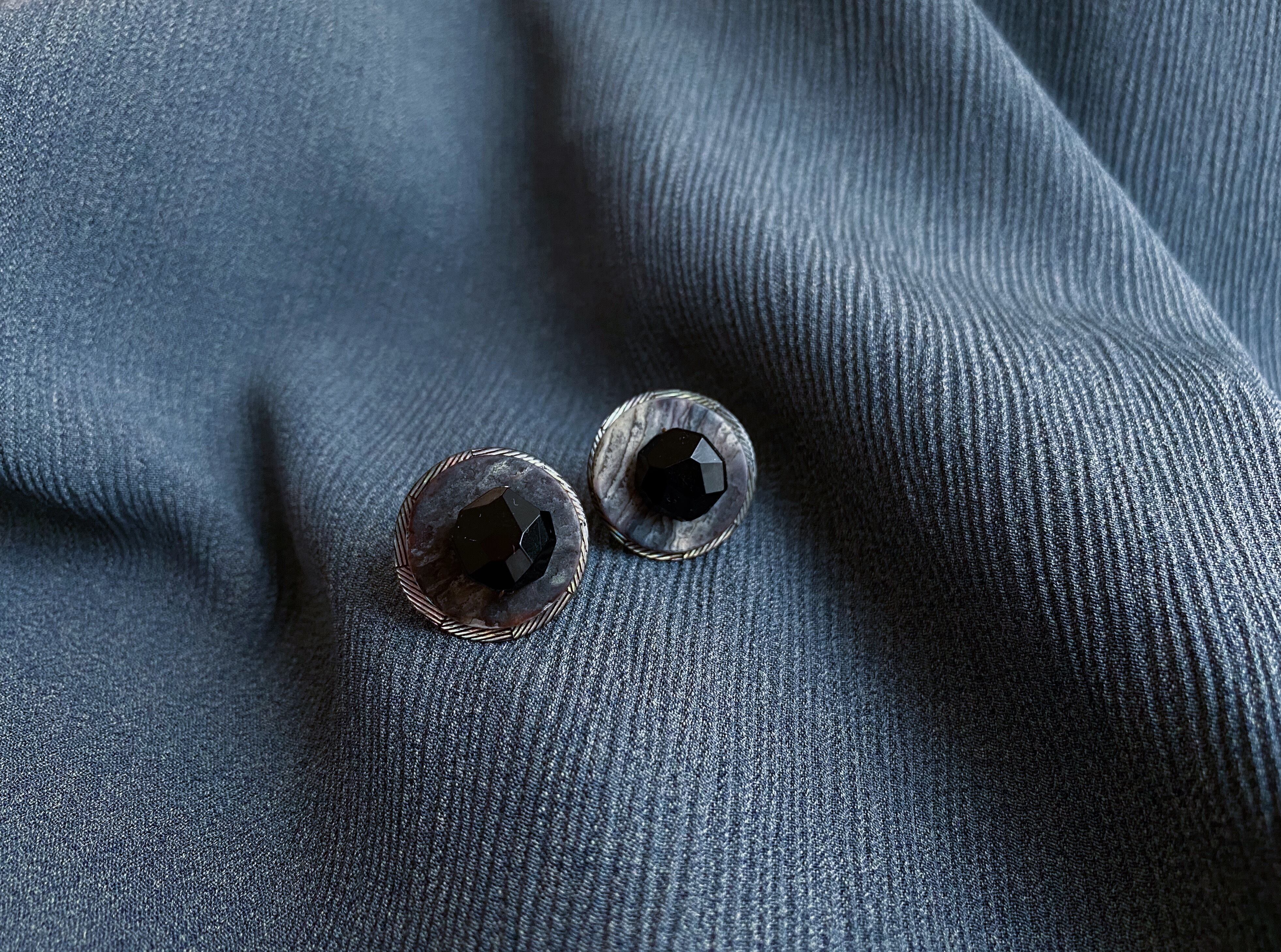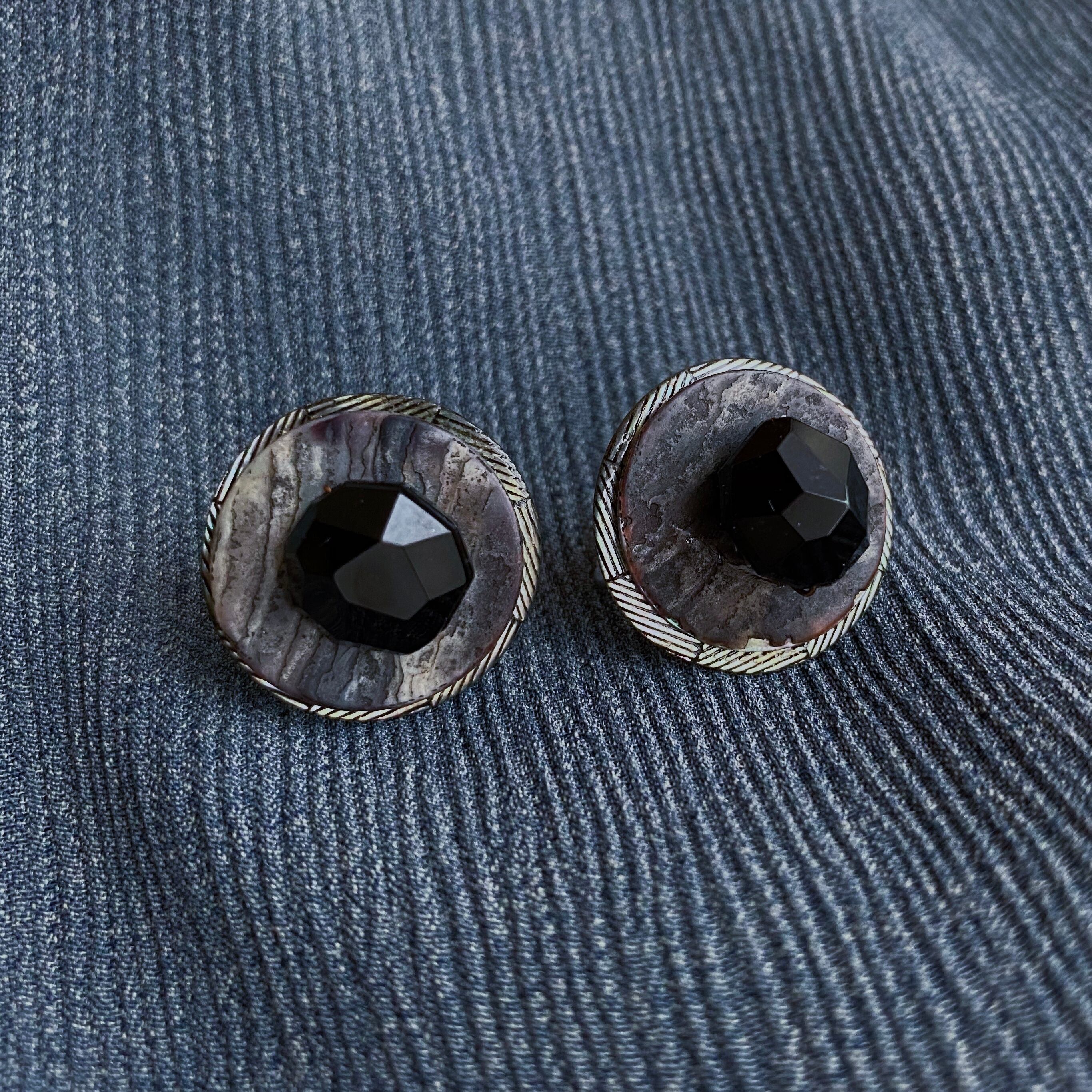 ゴロッとした黒色のビーズをシェルボタンのお皿に配した黒ビーズのローストは、一点もののイヤリングです。