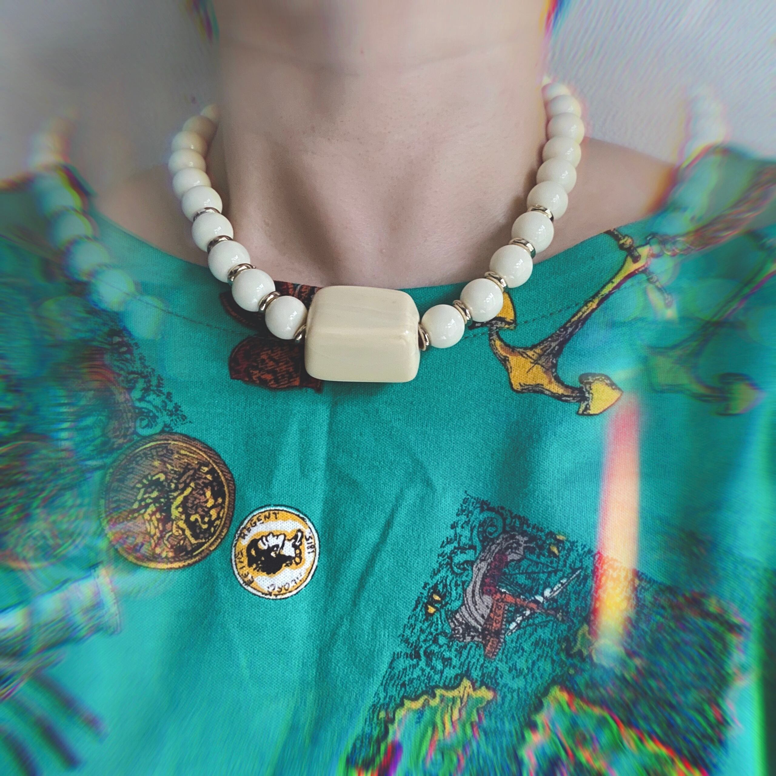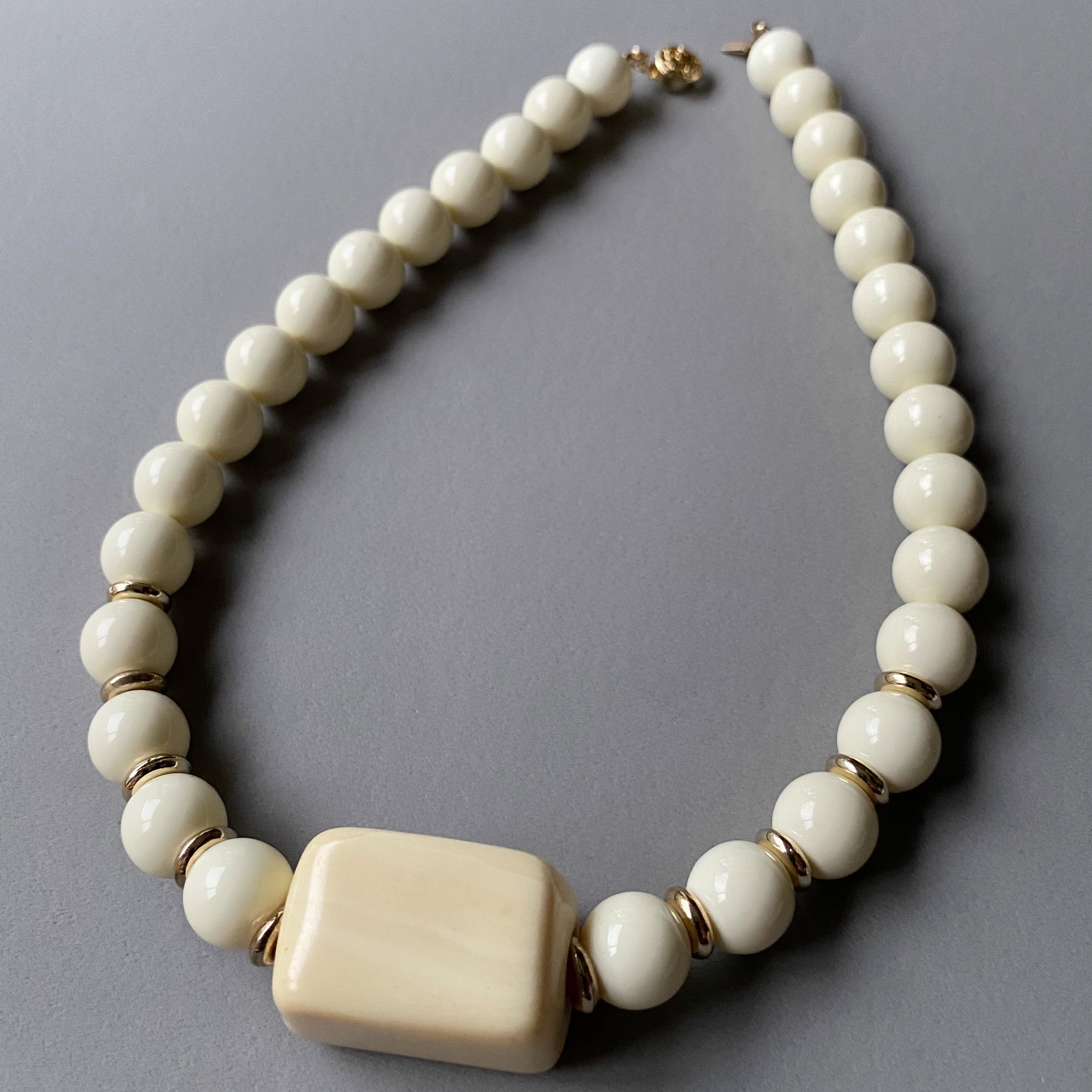 象牙色(アイボリー)の四角いビンテージパーツを主役にしたシンプルなデザインのネックレス