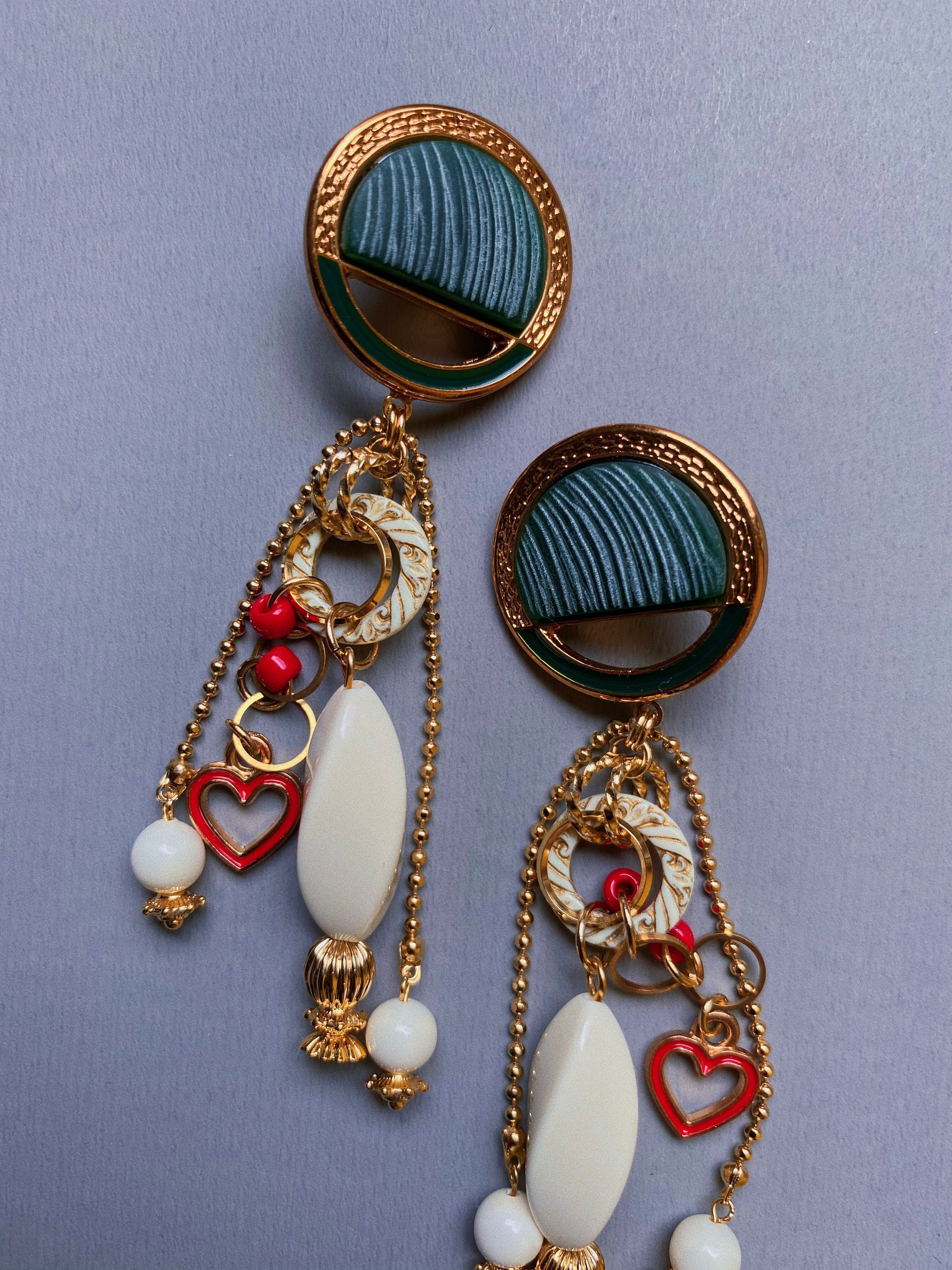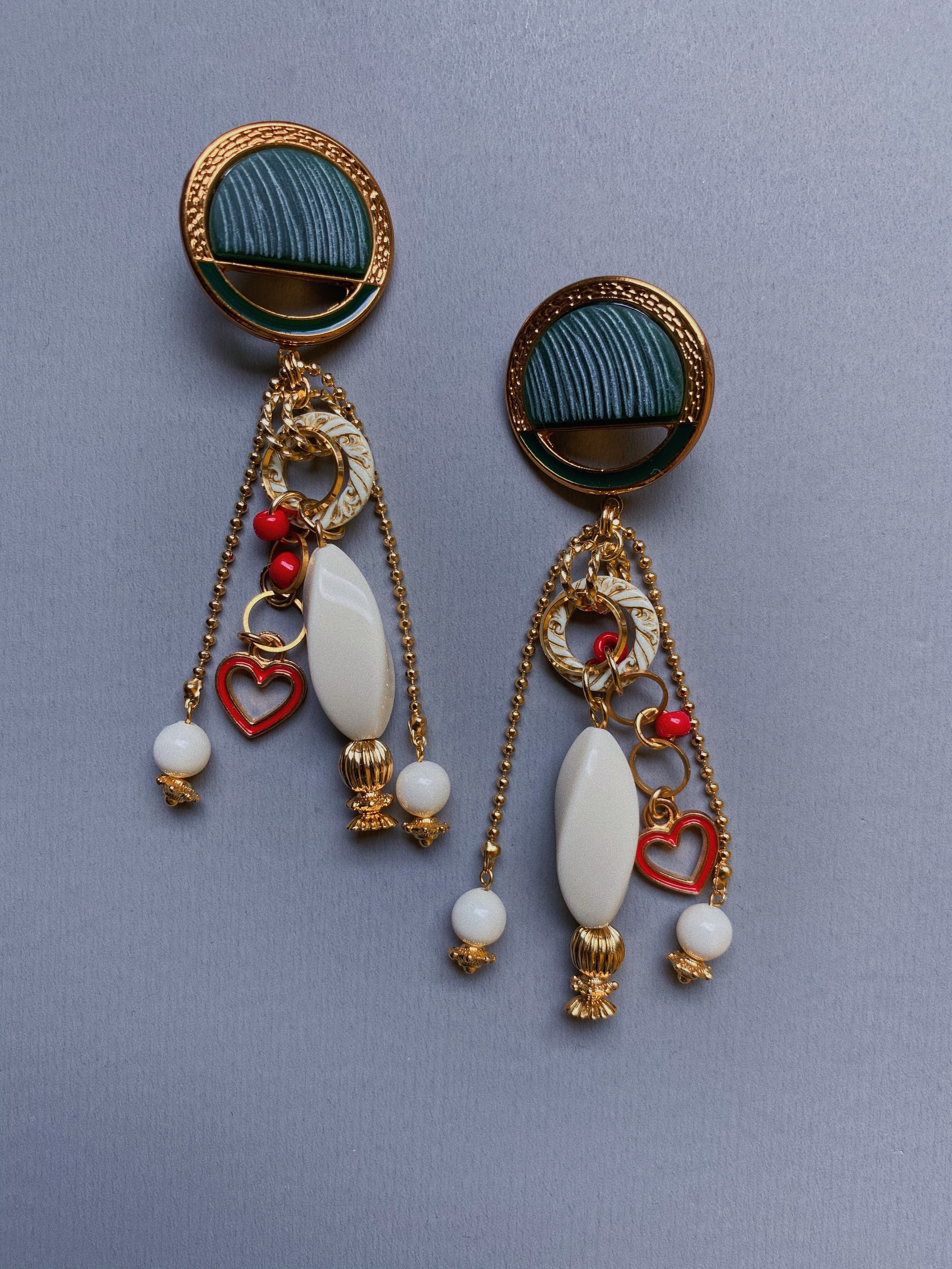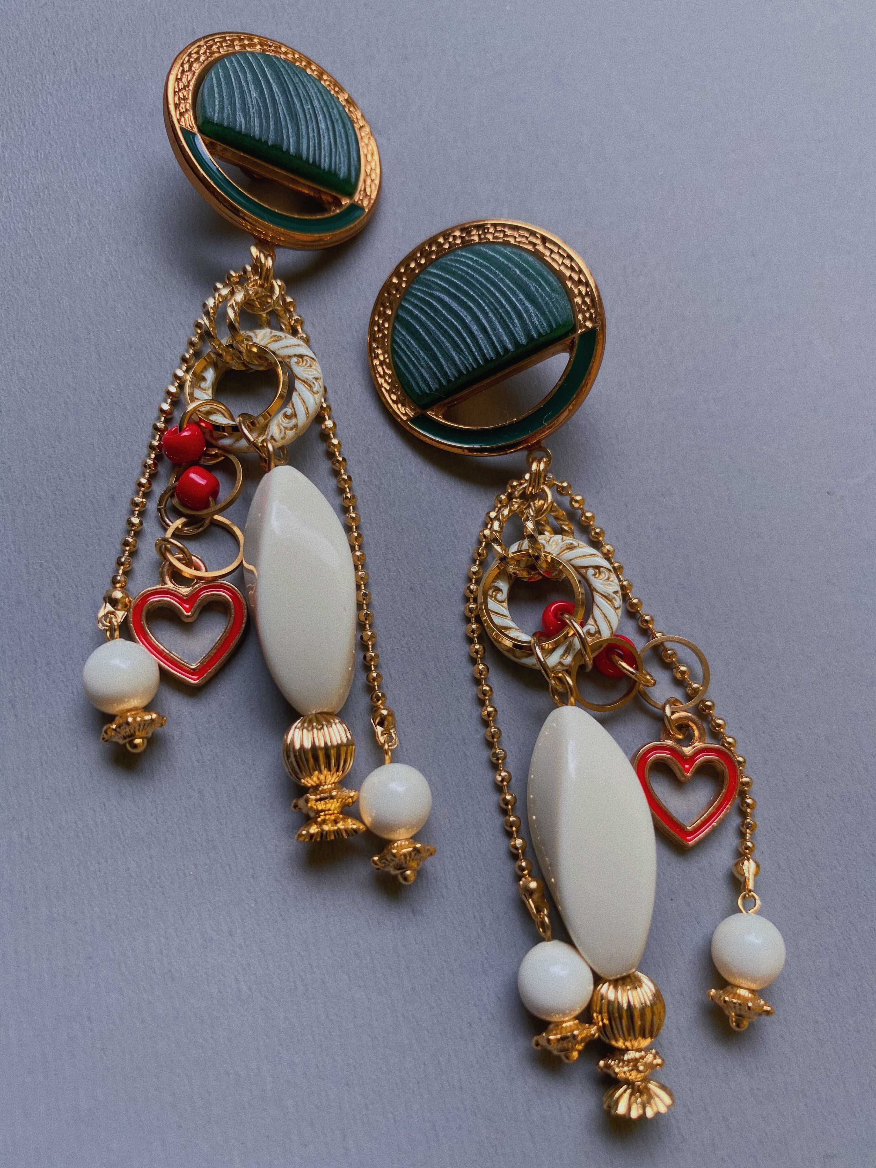 重厚感のあるボタンパーツの雰囲気を活かしつつ、ハートのチャームを合わせてキッチュに仕上げたイヤーアクセサリー
