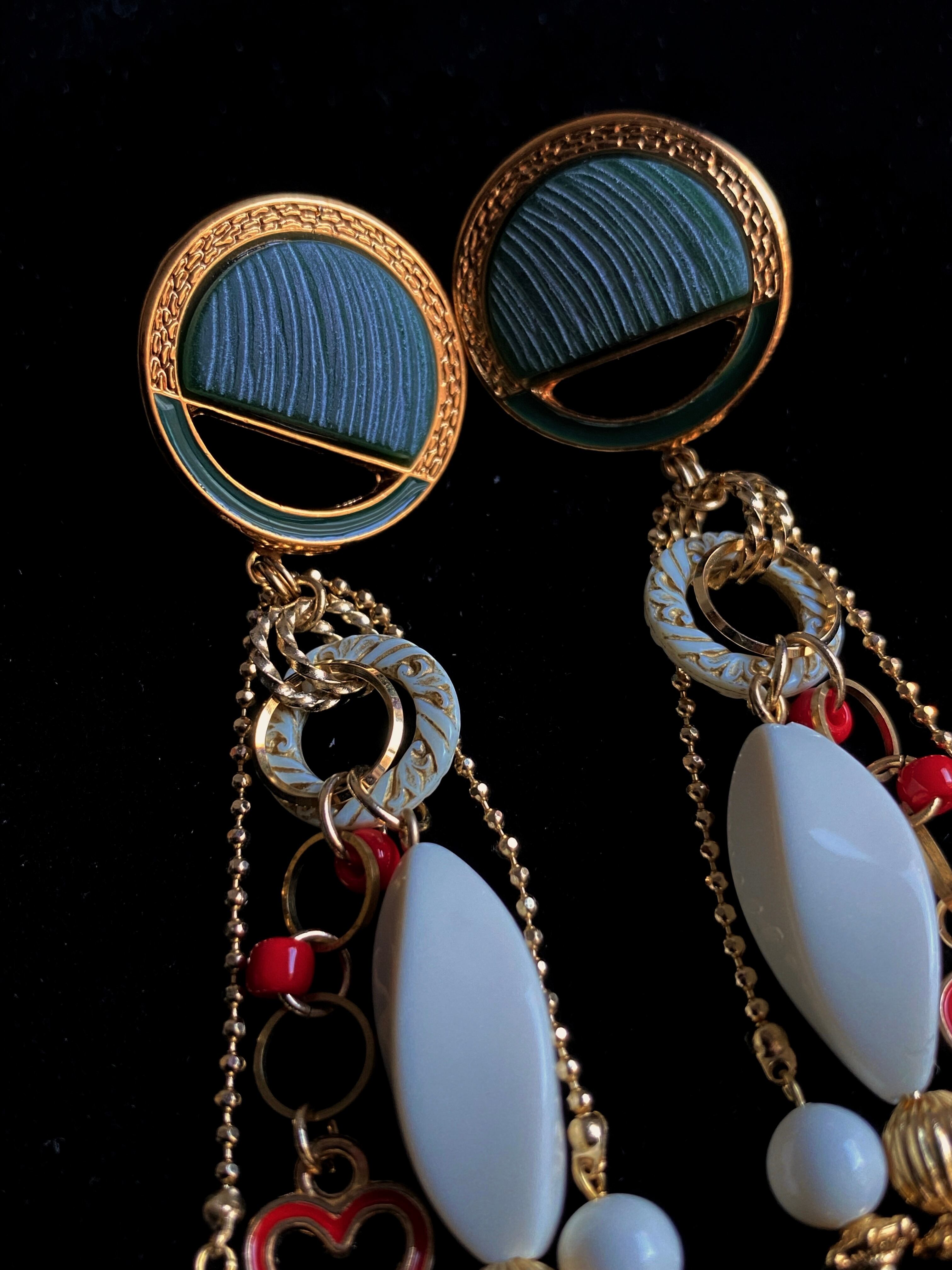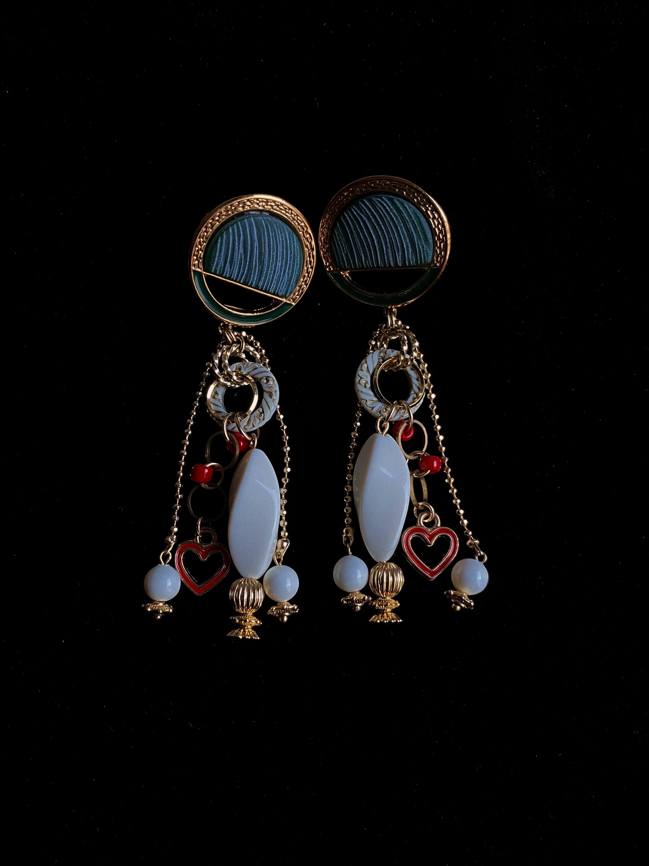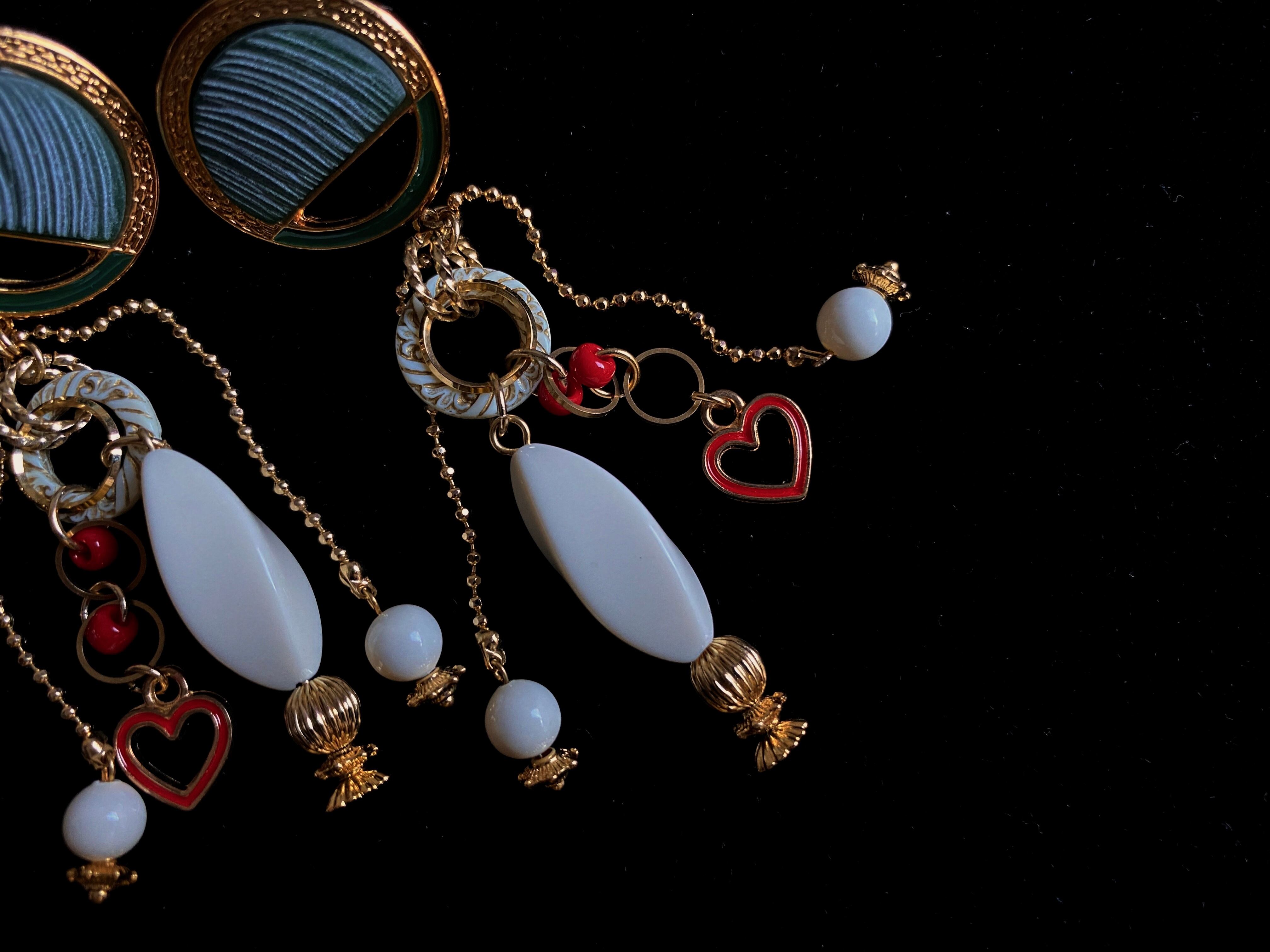重厚感のあるボタンパーツの雰囲気を活かしつつ、ハートのチャームを合わせてキッチュに仕上げたイヤーアクセサリー