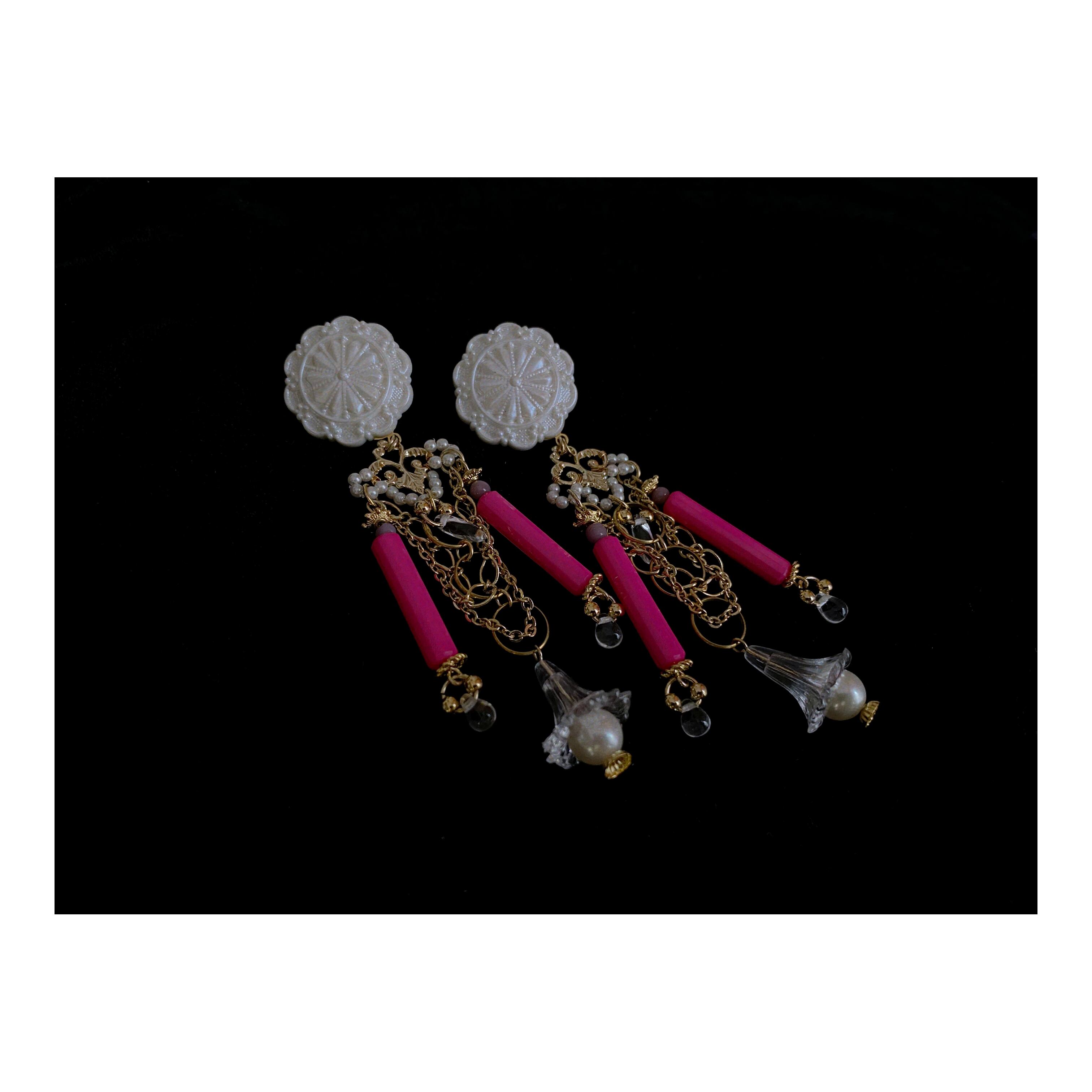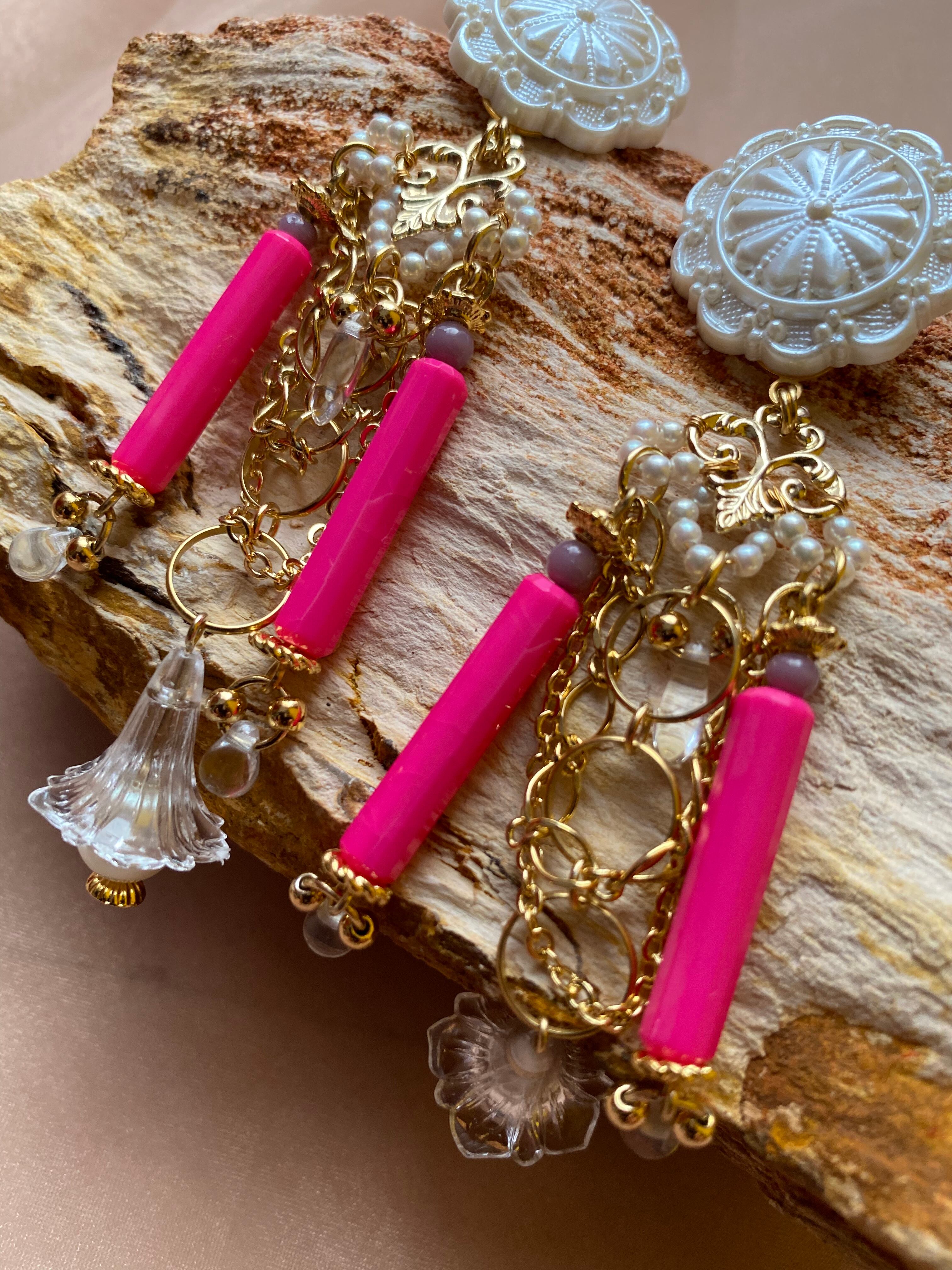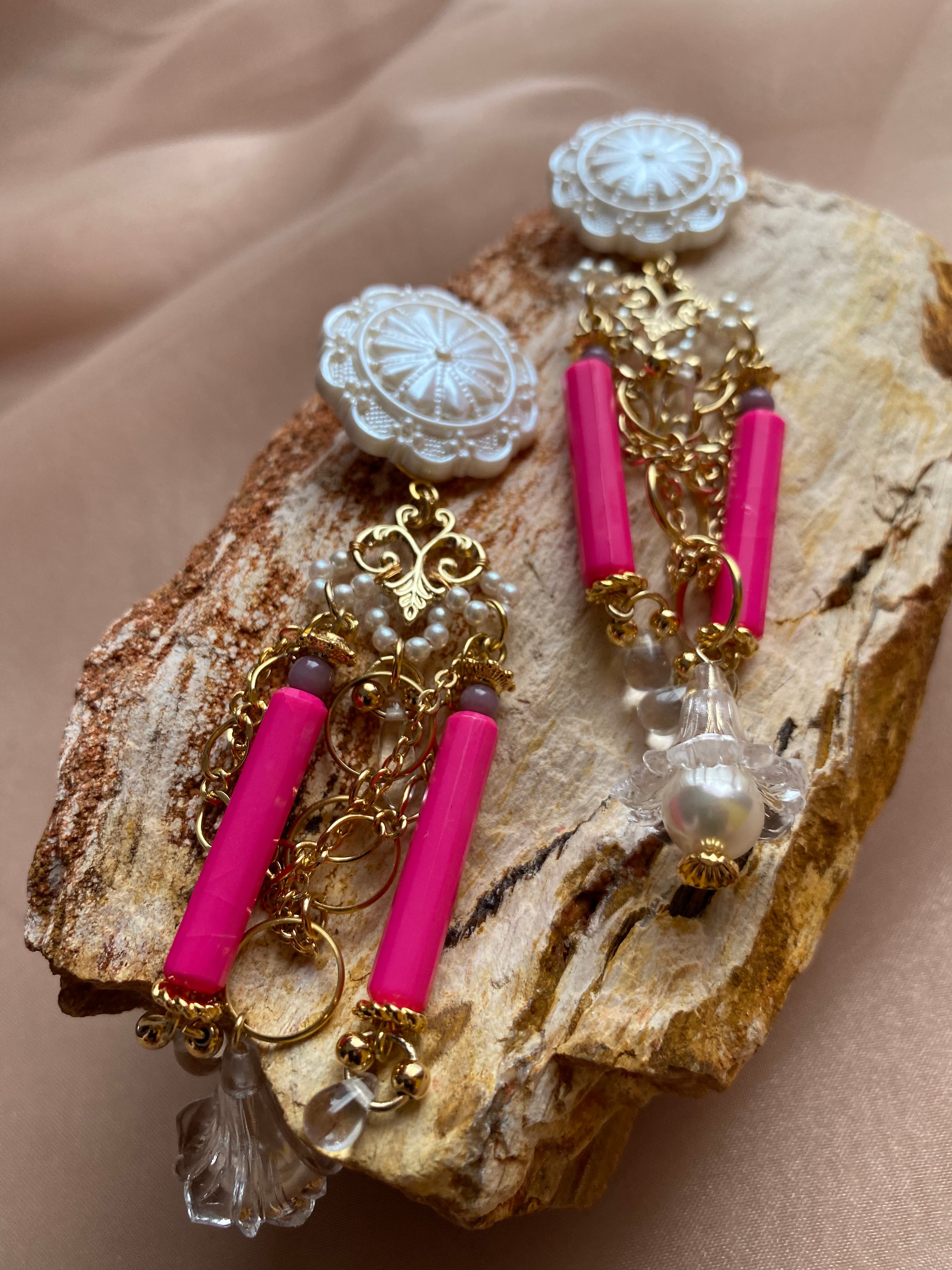 パールホワイトに鮮やかなデッドストックビーズを組み合わせたイヤーアクセサリー