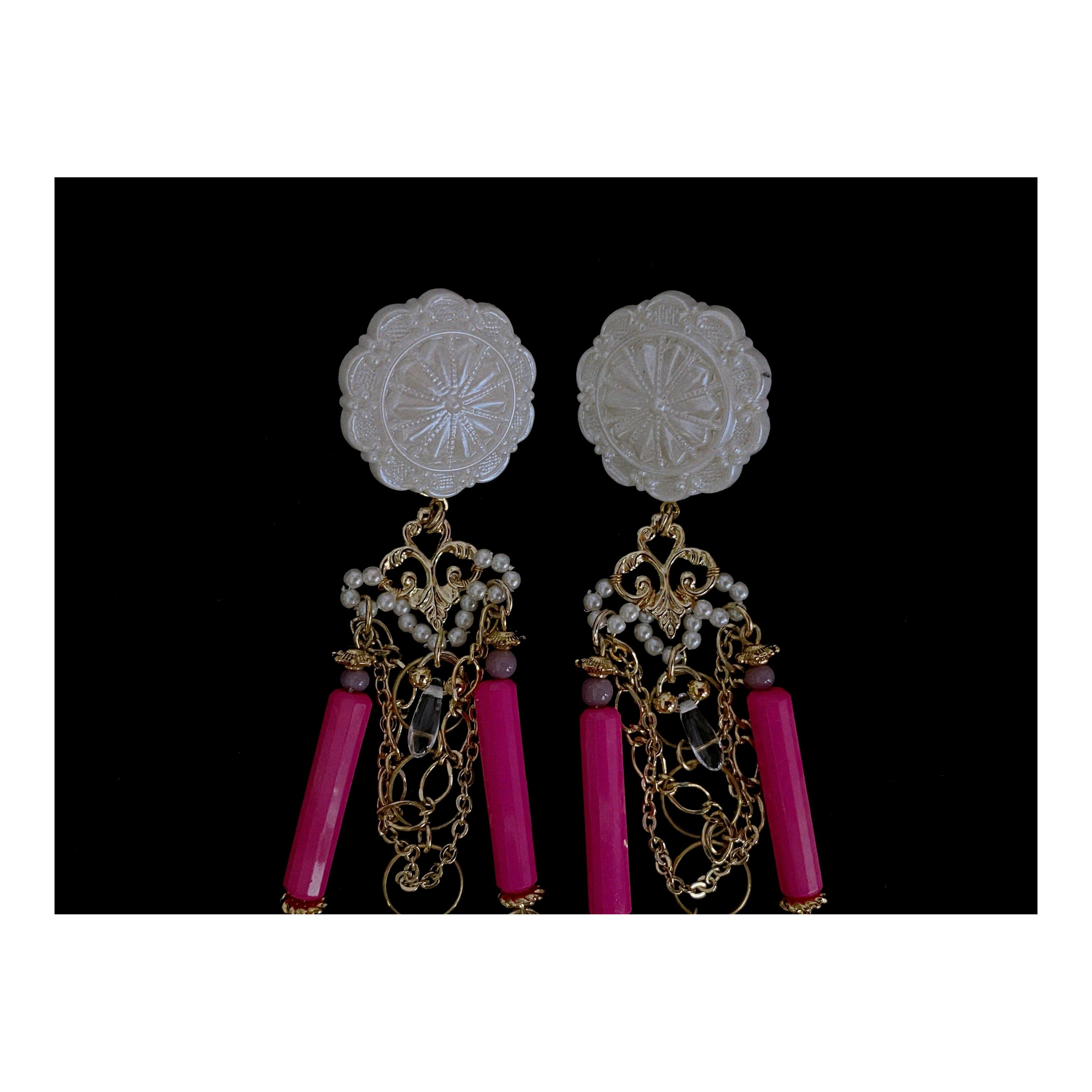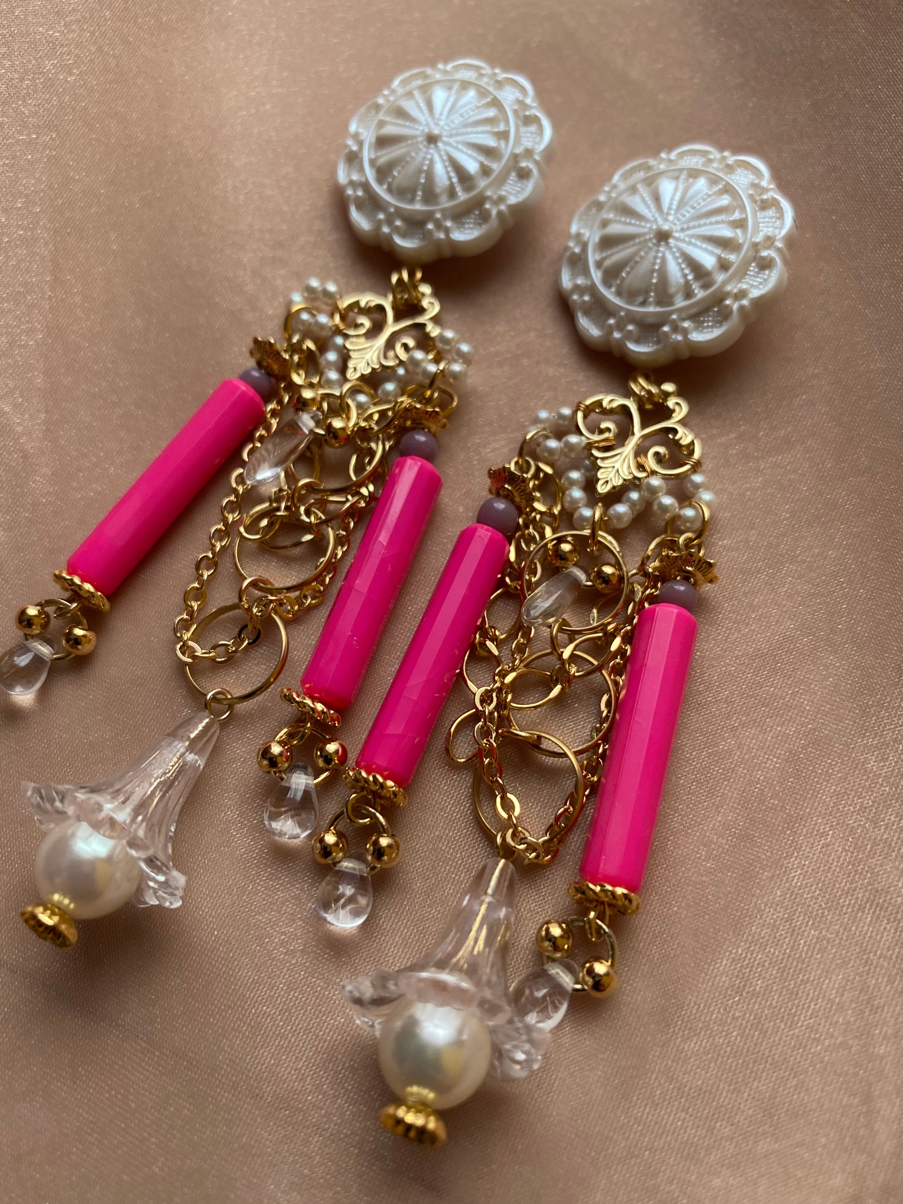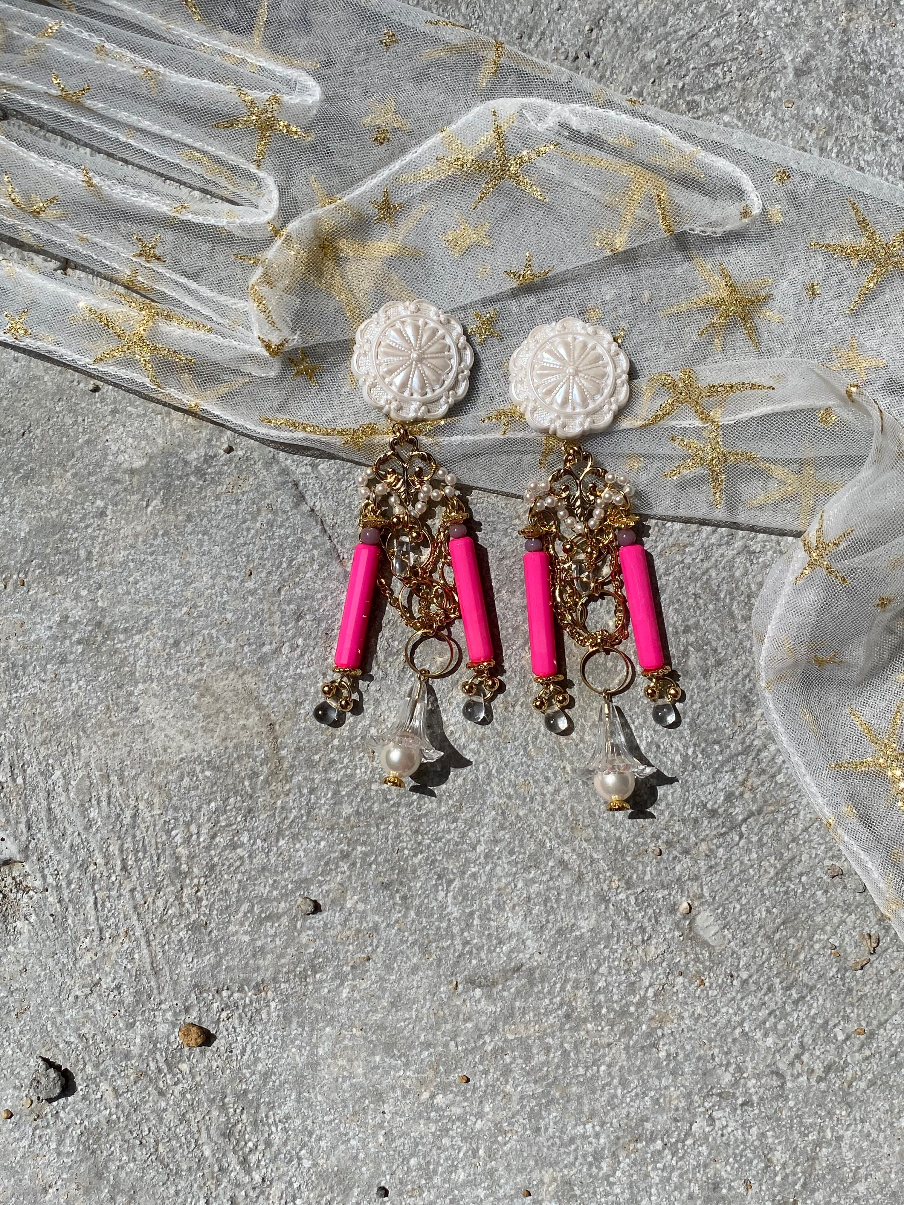 パールホワイトに鮮やかなデッドストックビーズを組み合わせたイヤーアクセサリー