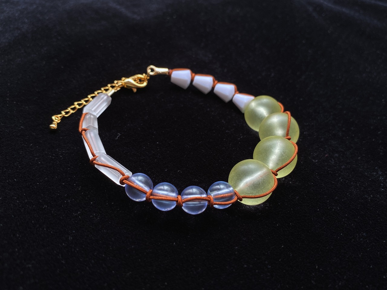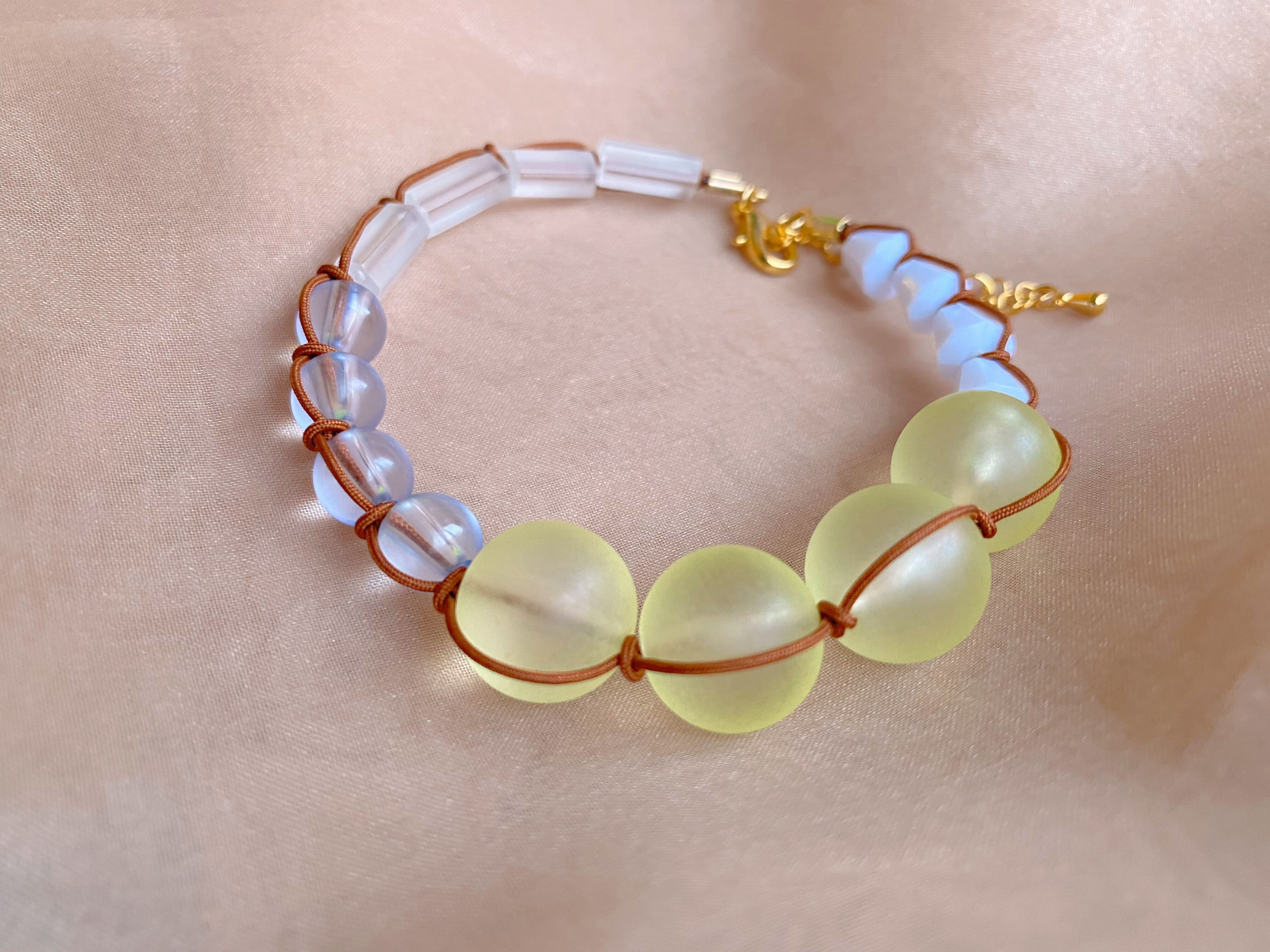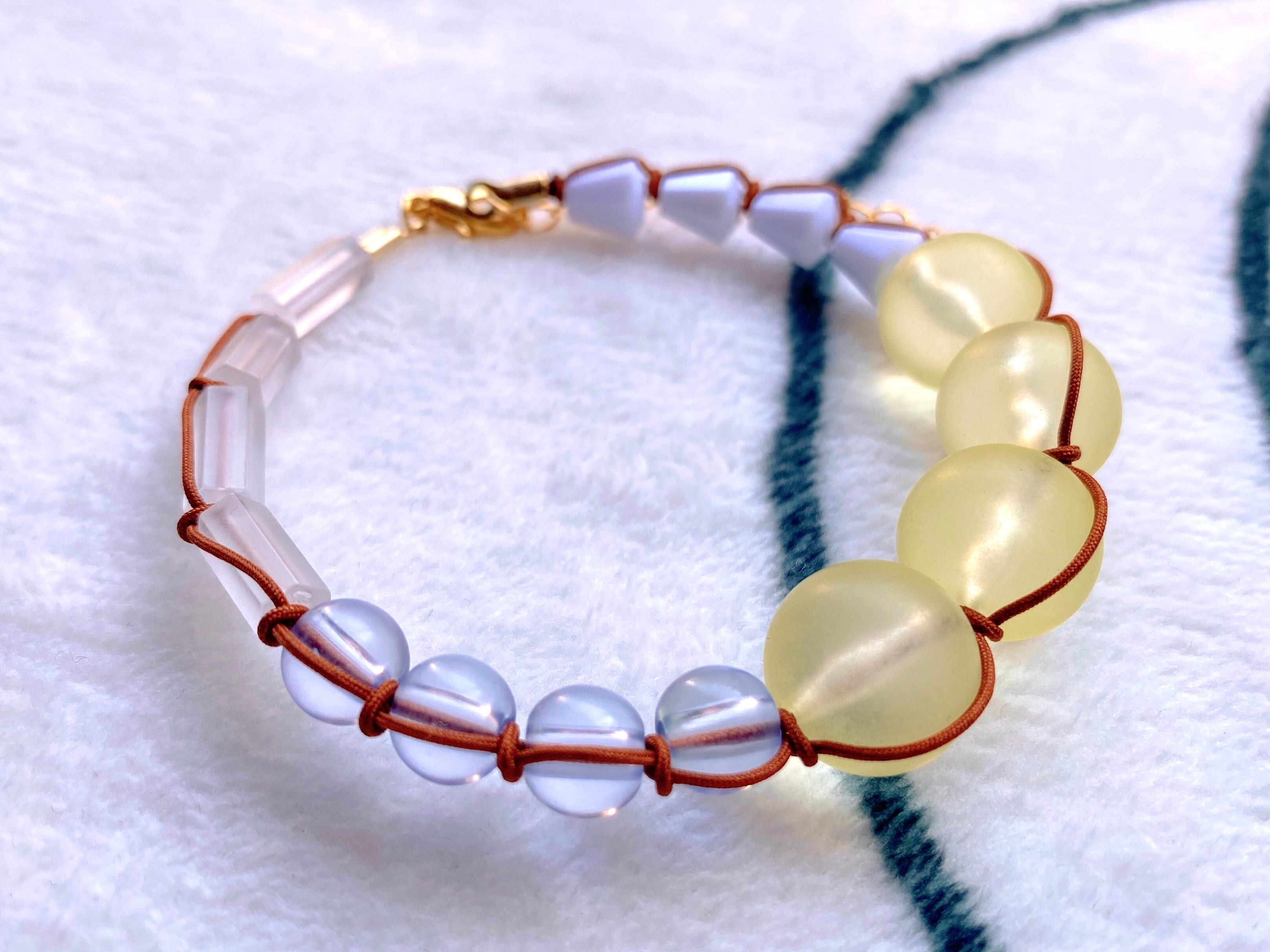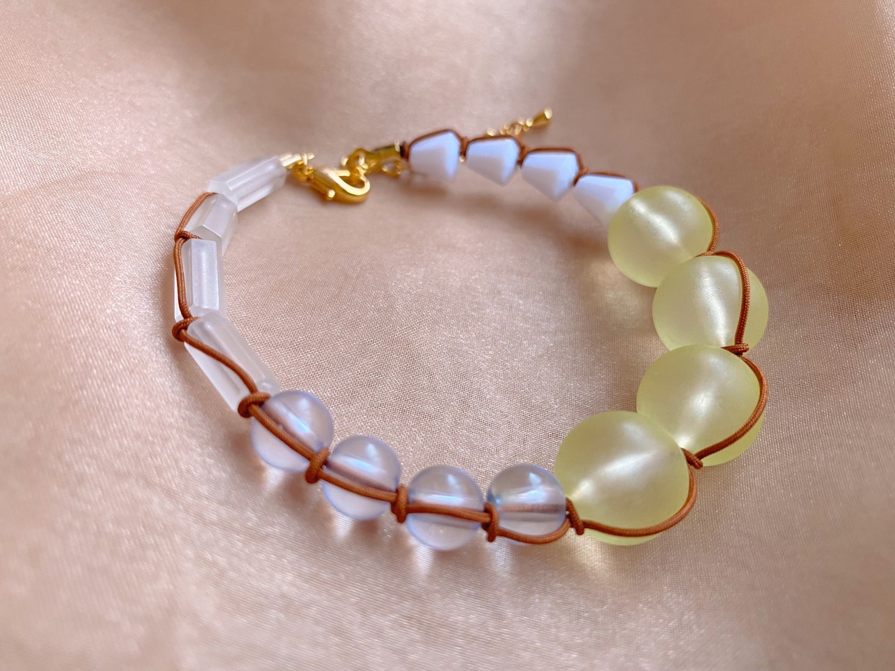 レモンイエロー、ペールブルー、ホワイト、クリアカラーの涼しげな色合いが春夏にぴったりです。かわいらしい色味にブラウンのカラーコードを合わせることで少し落ち着いた大人な雰囲気になっています。ほとんどがデッドストックパーツのため、人と被らないデザインを求めている方にもおすすめです。