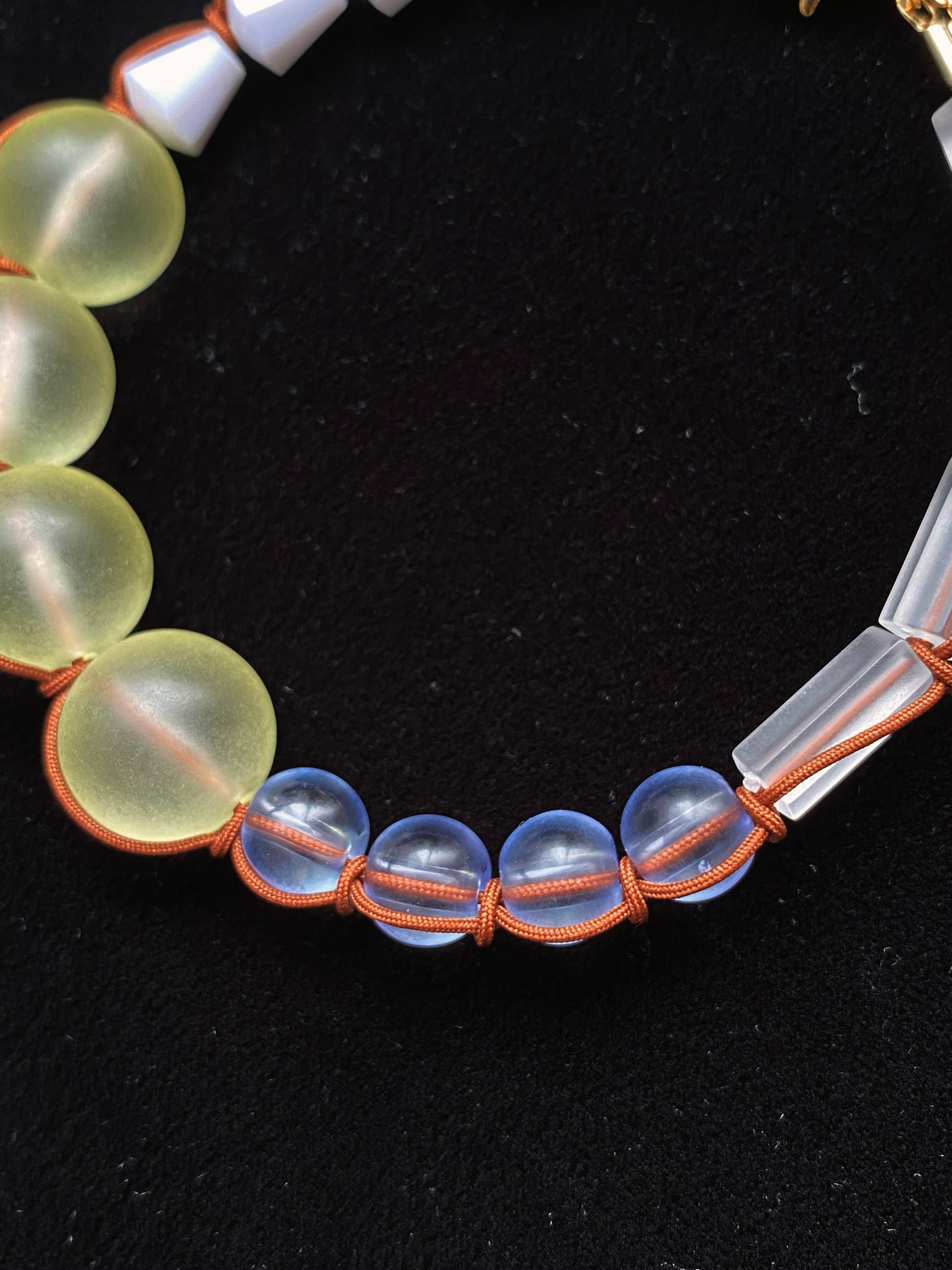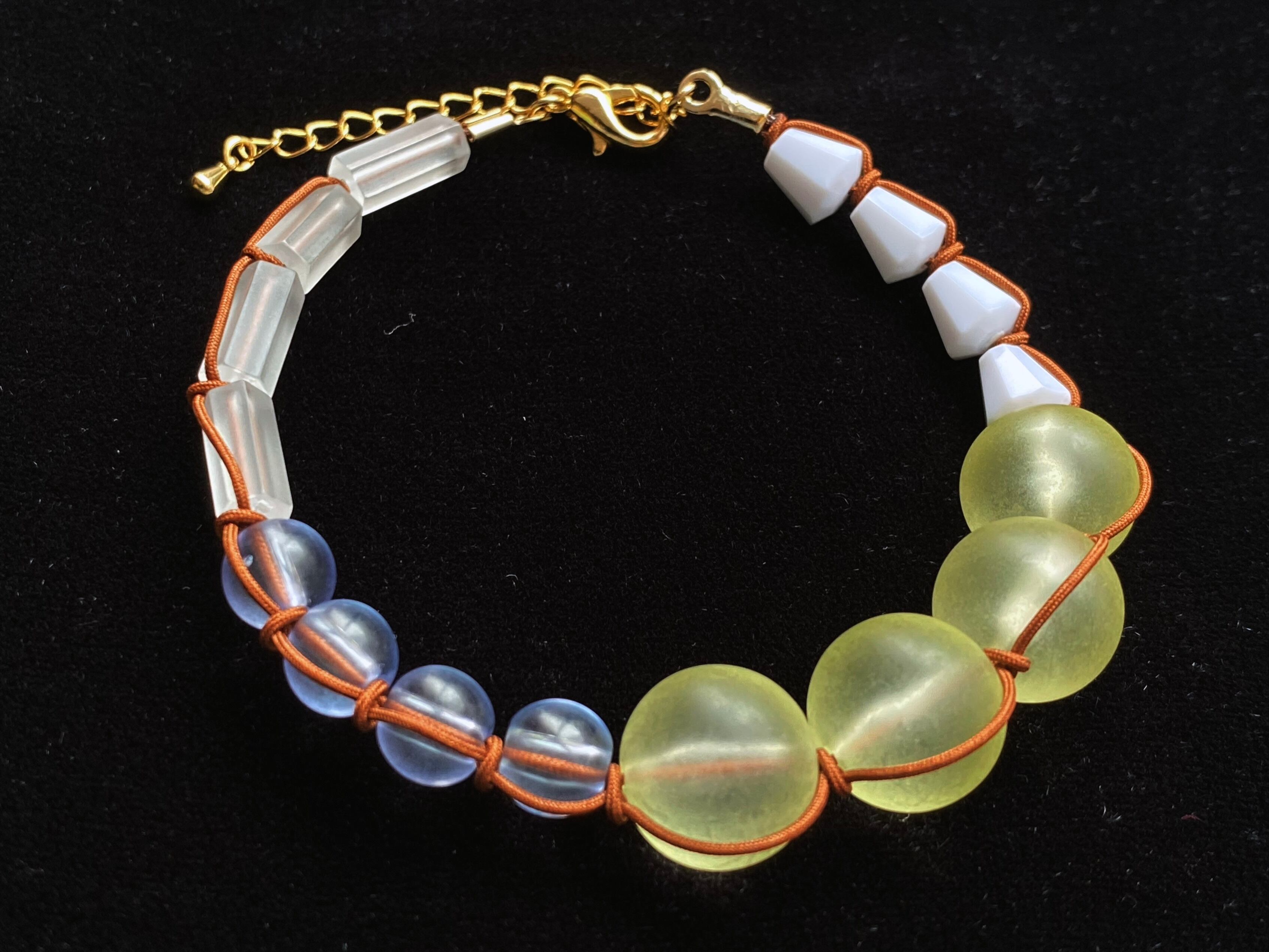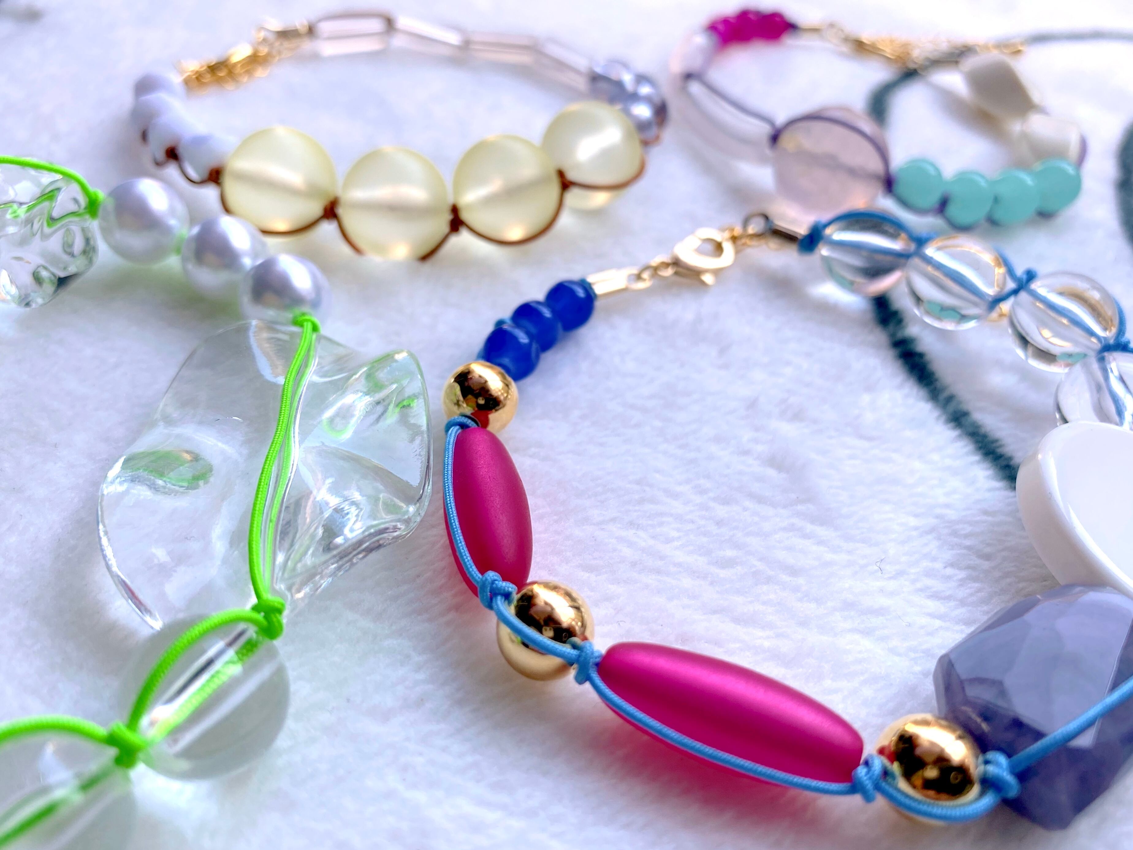 レモンイエロー、ペールブルー、ホワイト、クリアカラーの涼しげな色合いが春夏にぴったりです。かわいらしい色味にブラウンのカラーコードを合わせることで少し落ち着いた大人な雰囲気になっています。ほとんどがデッドストックパーツのため、人と被らないデザインを求めている方にもおすすめです。