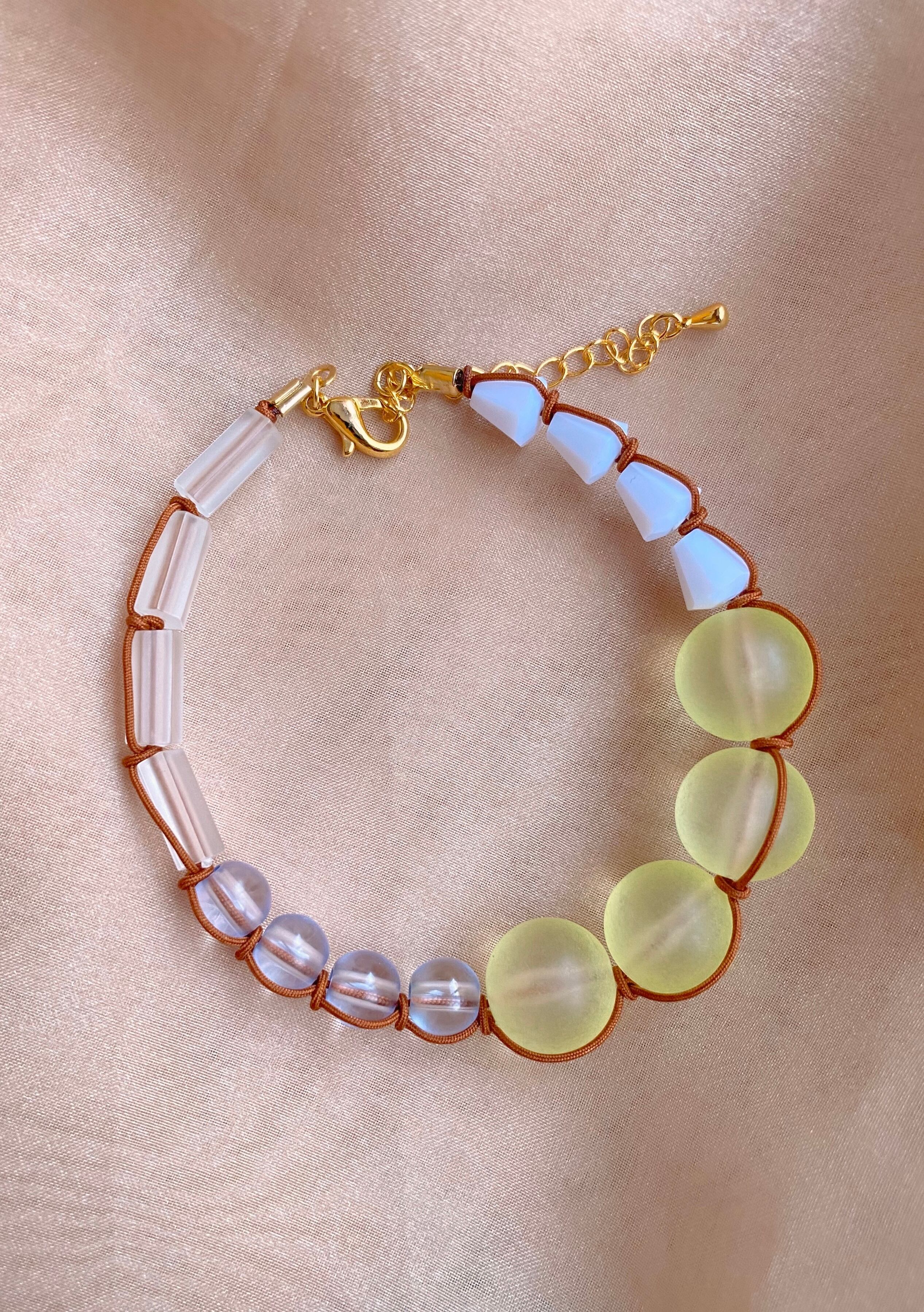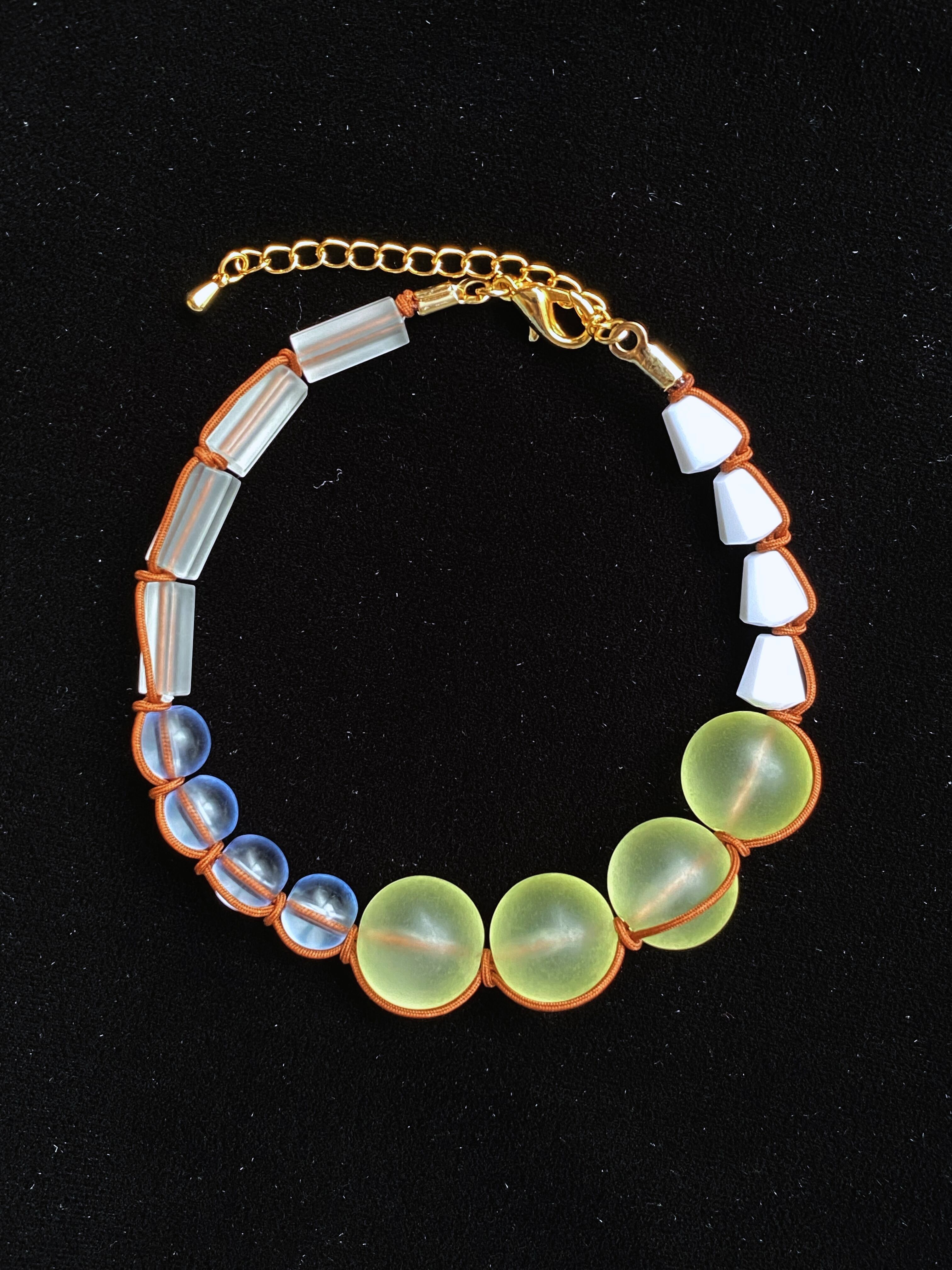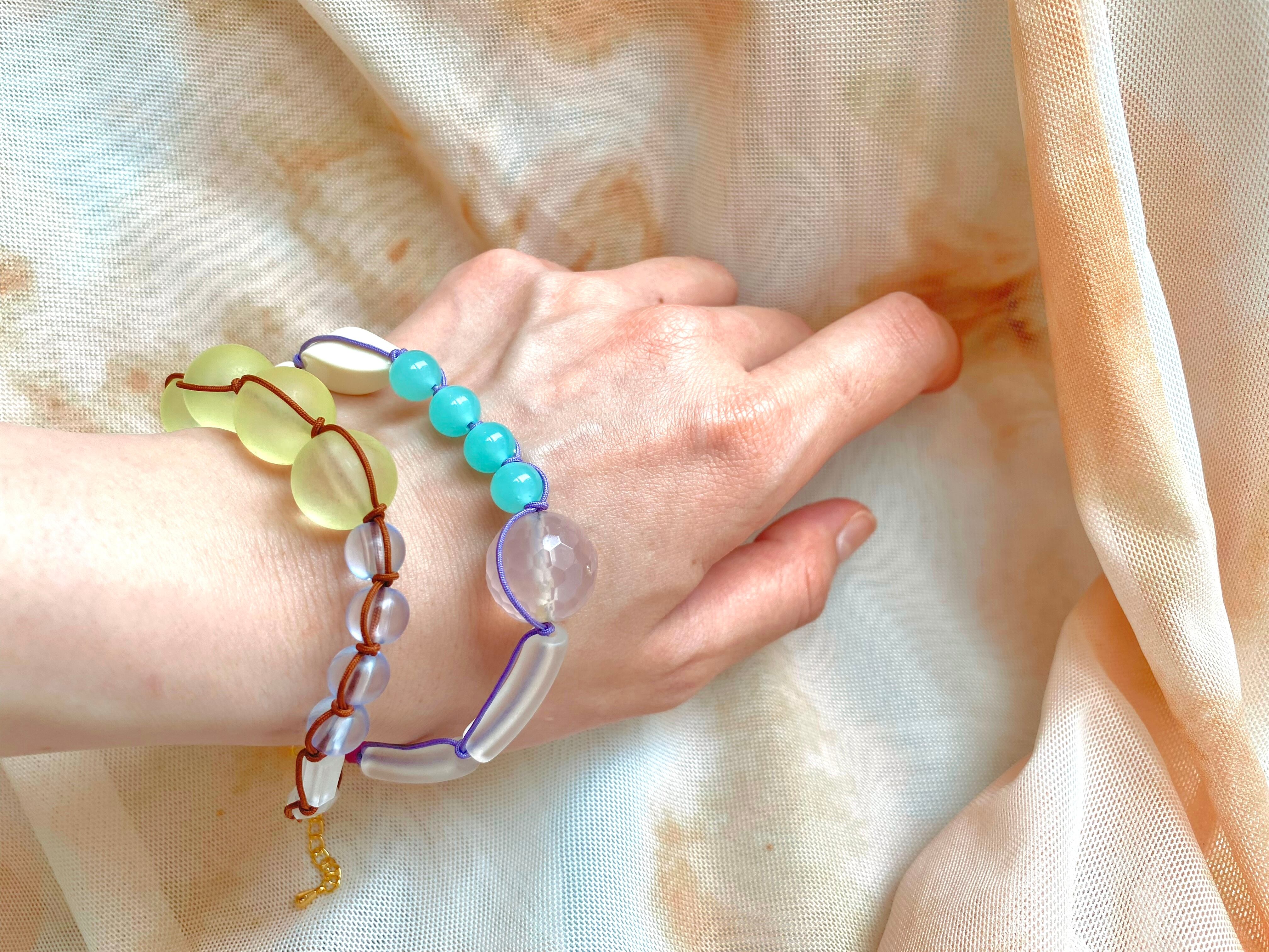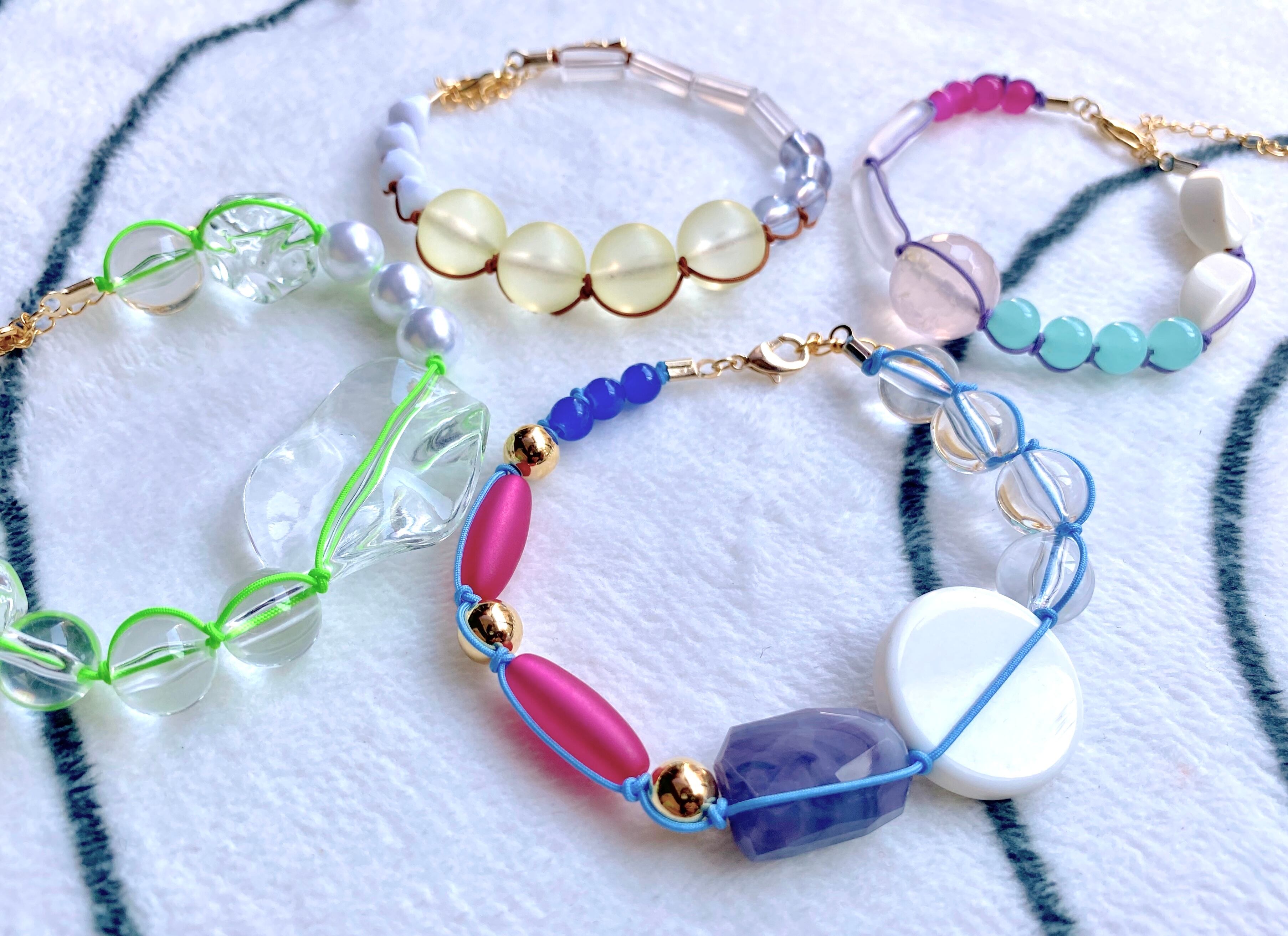 レモンイエロー、ペールブルー、ホワイト、クリアカラーの涼しげな色合いが春夏にぴったりです。かわいらしい色味にブラウンのカラーコードを合わせることで少し落ち着いた大人な雰囲気になっています。ほとんどがデッドストックパーツのため、人と被らないデザインを求めている方にもおすすめです。