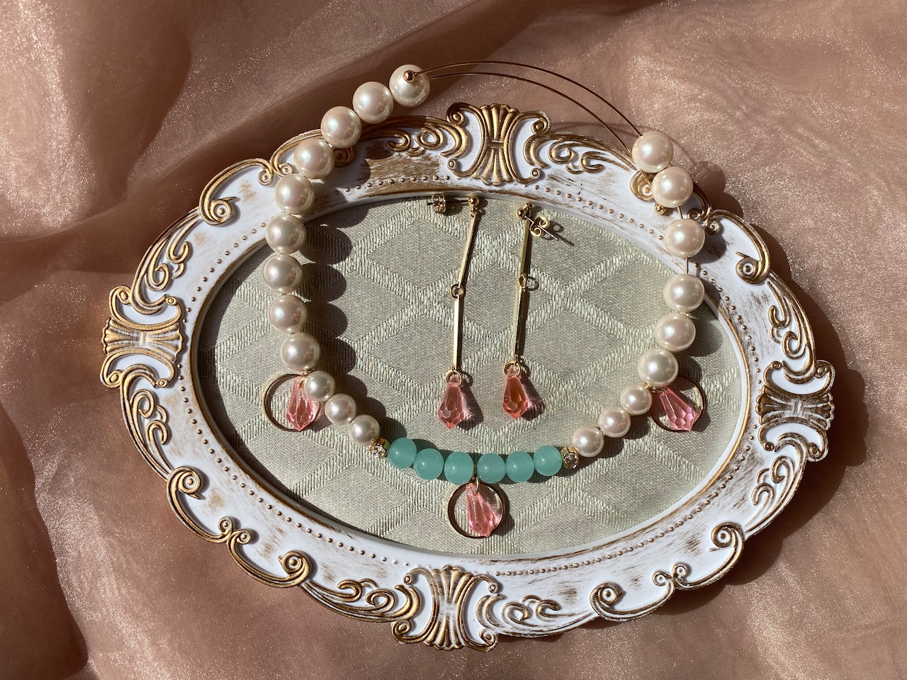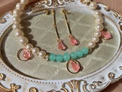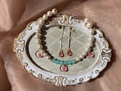 素材:ウィンテージパーツ、シルキーパール、ガラス、合金