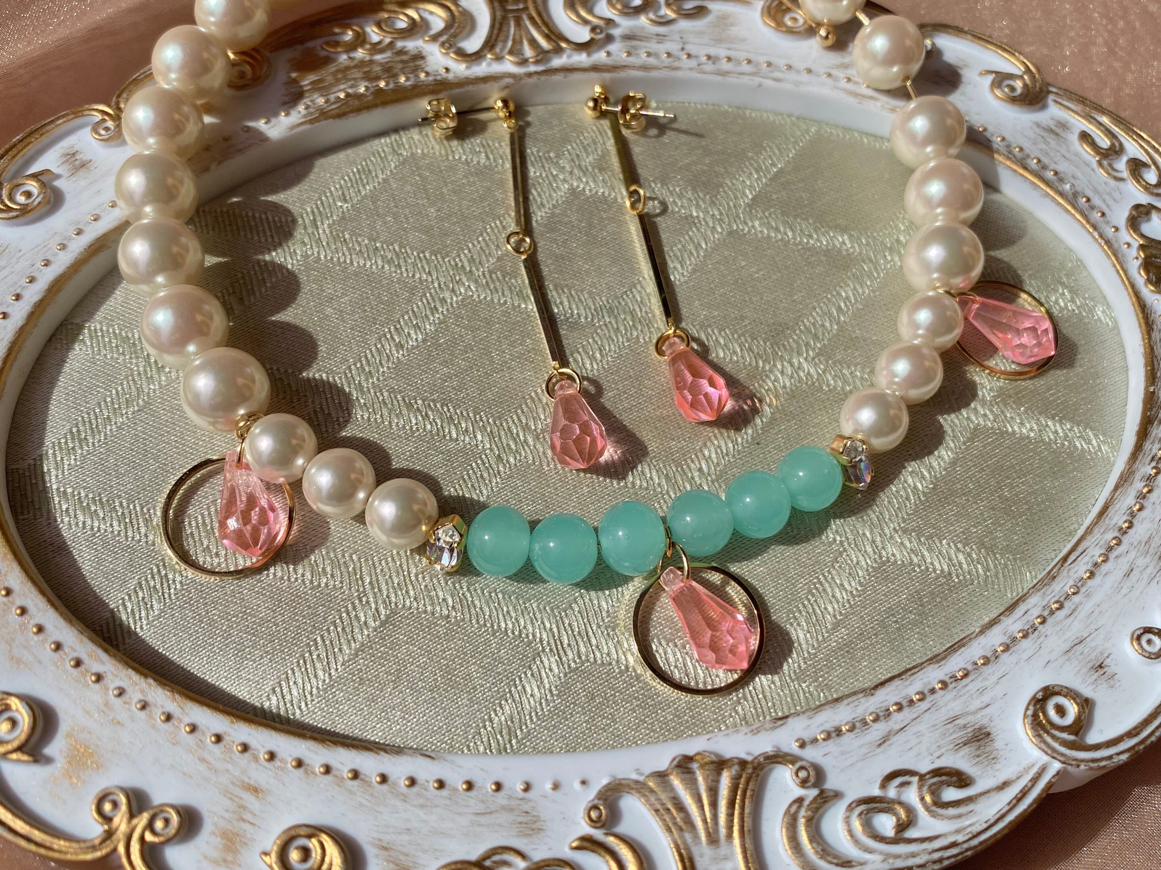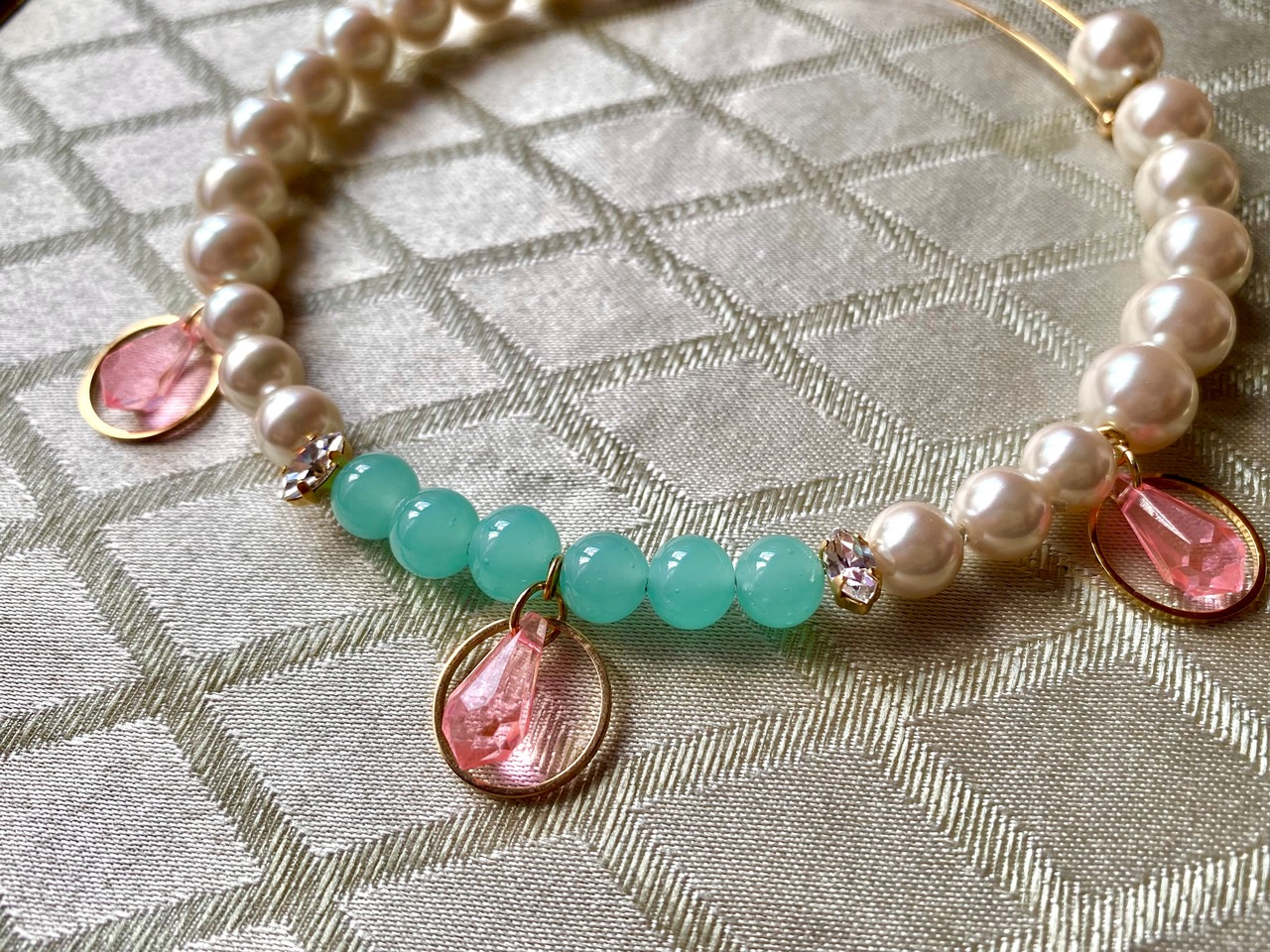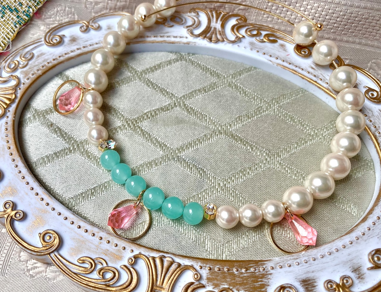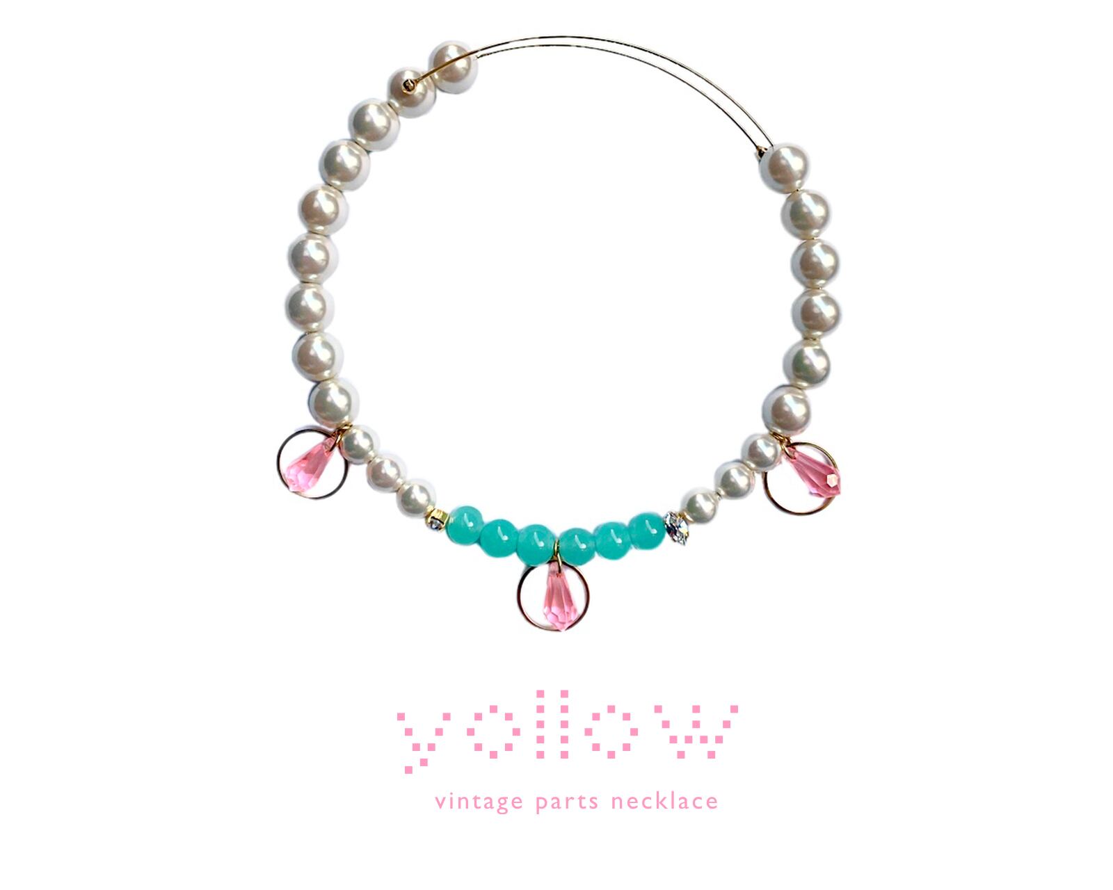 ミントグリーンのガラスビーズ、シルキーパールとピンク色のヴィンテージパーツを組み合わせたチョーカーネックレスです。