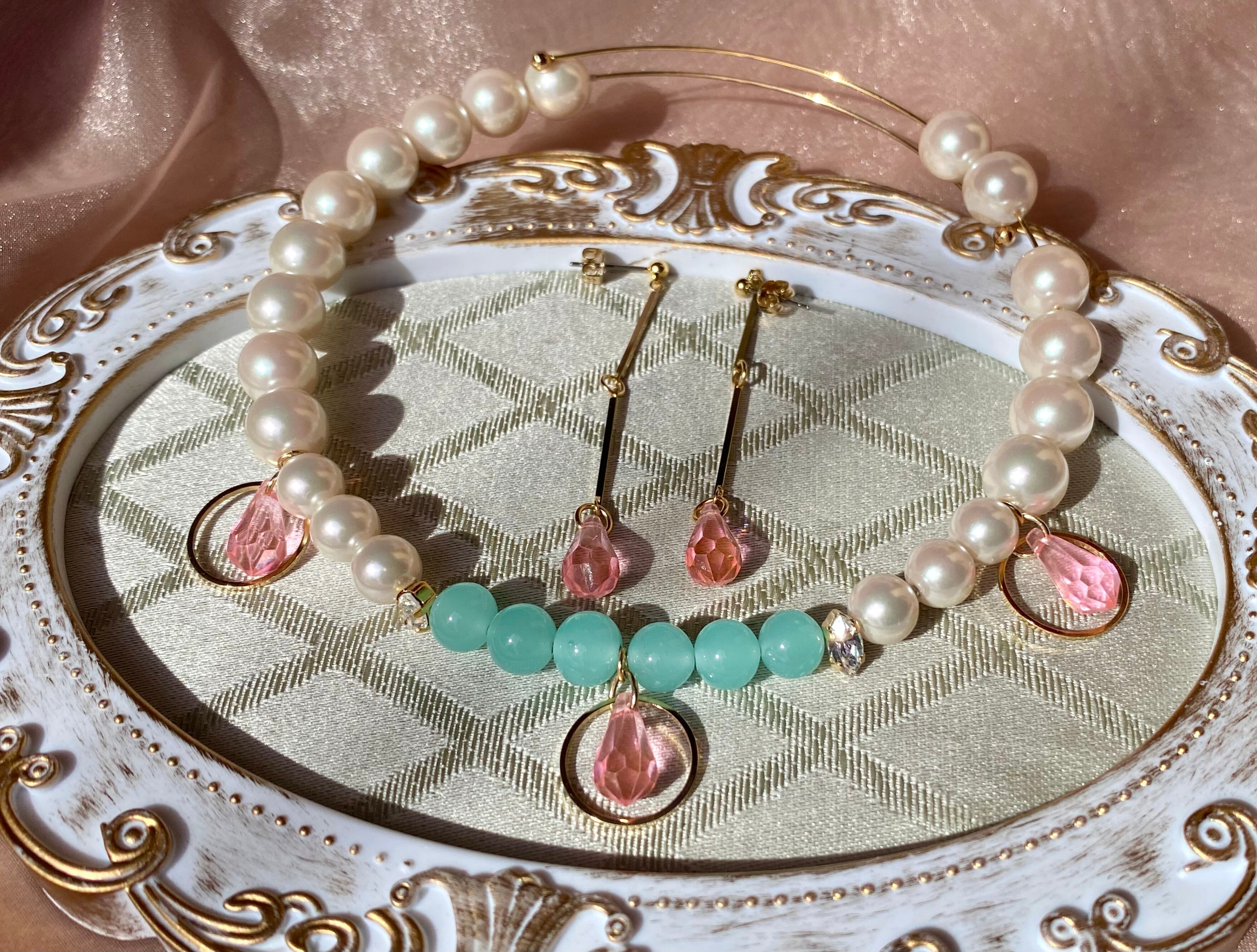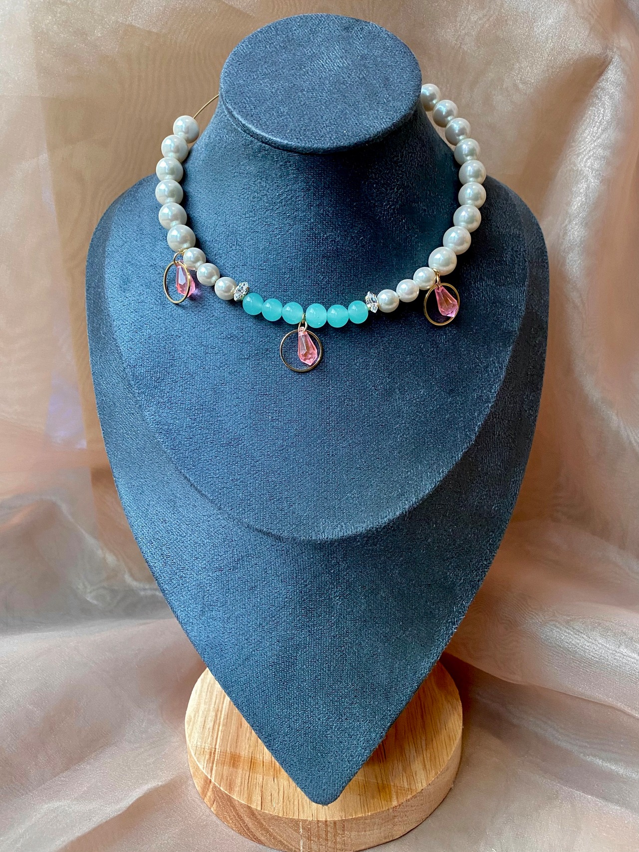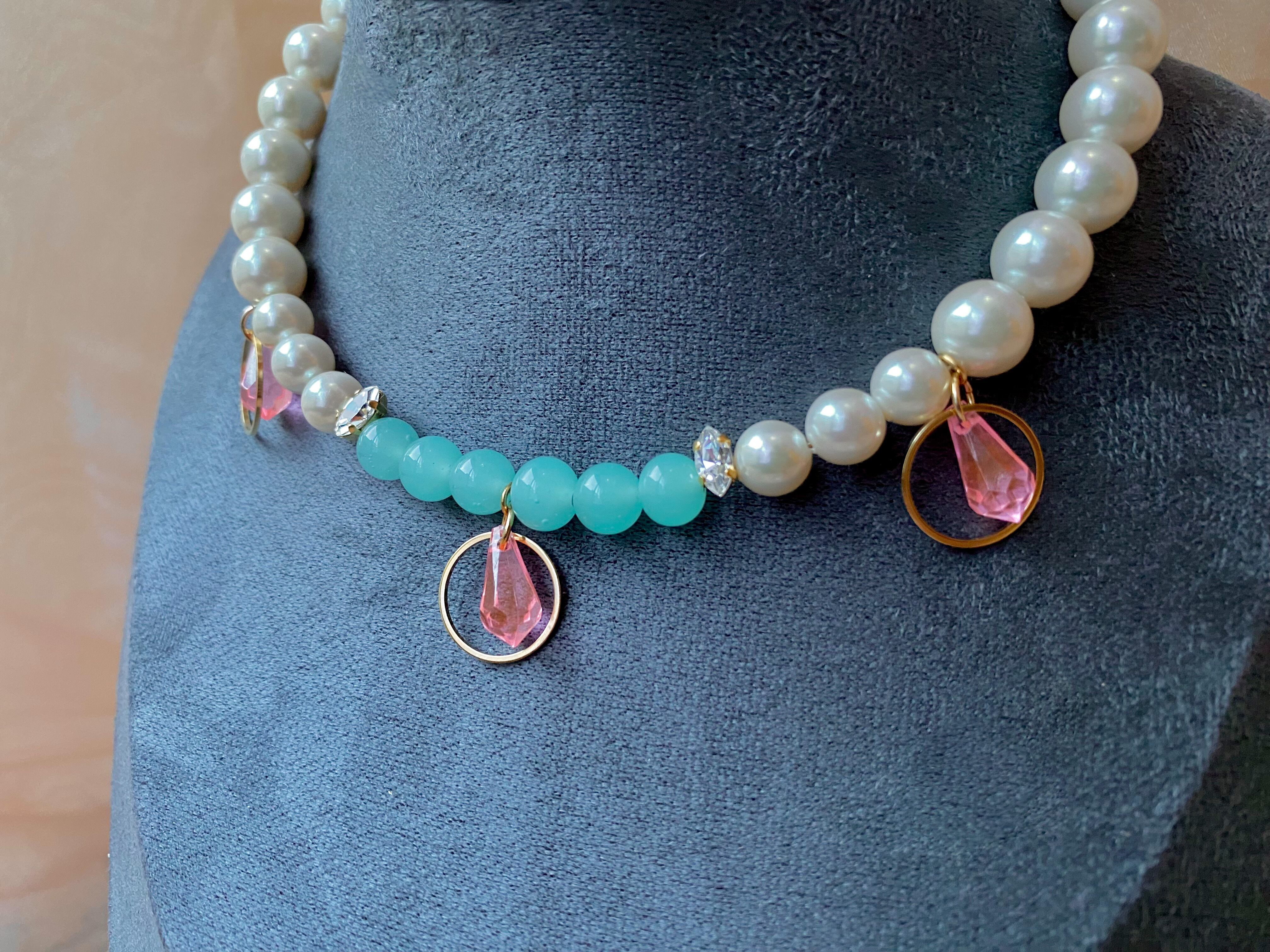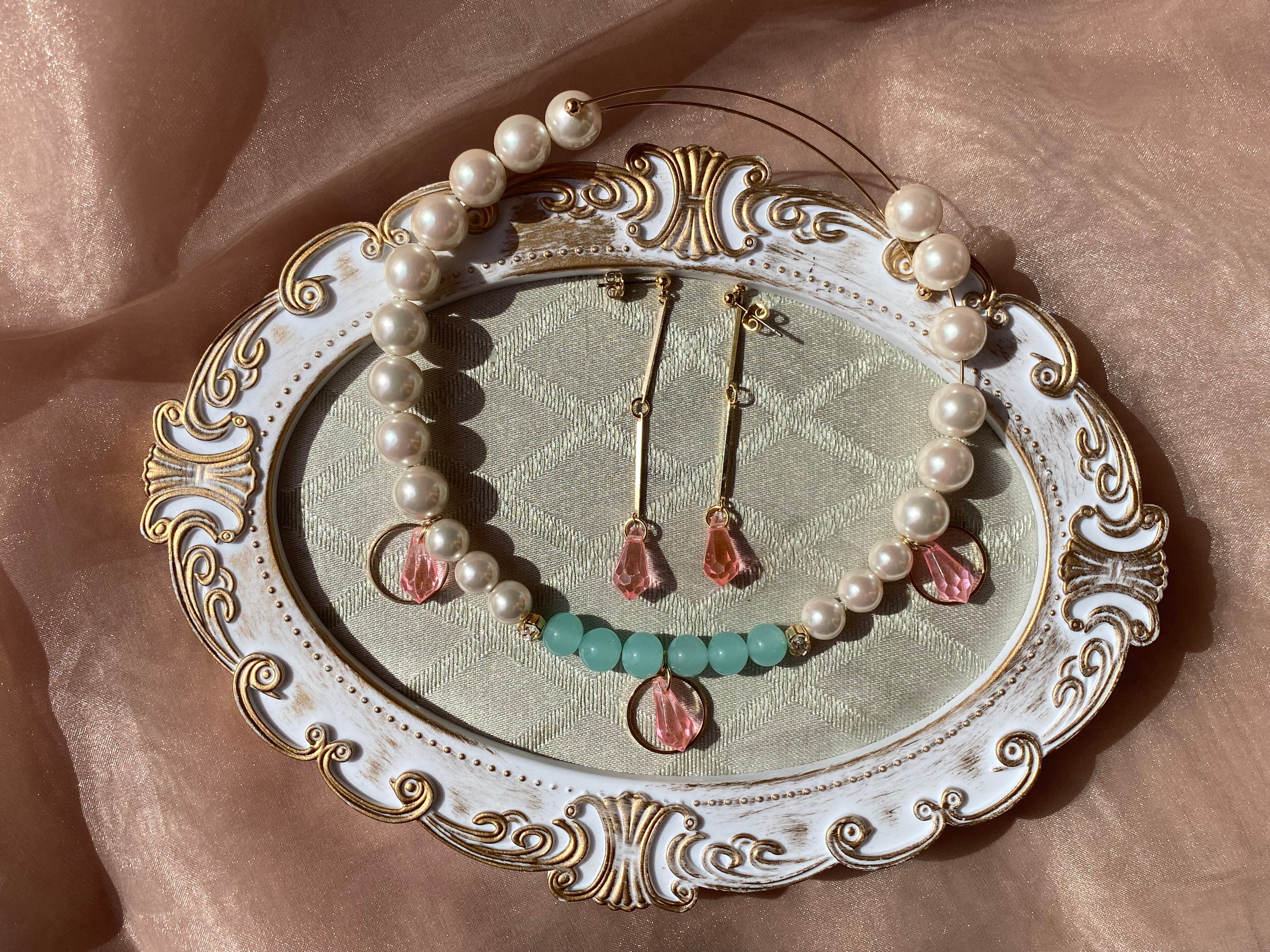 ミントグリーンのガラスビーズ、シルキーパールとピンク色のヴィンテージパーツを組み合わせたチョーカーネックレスです。