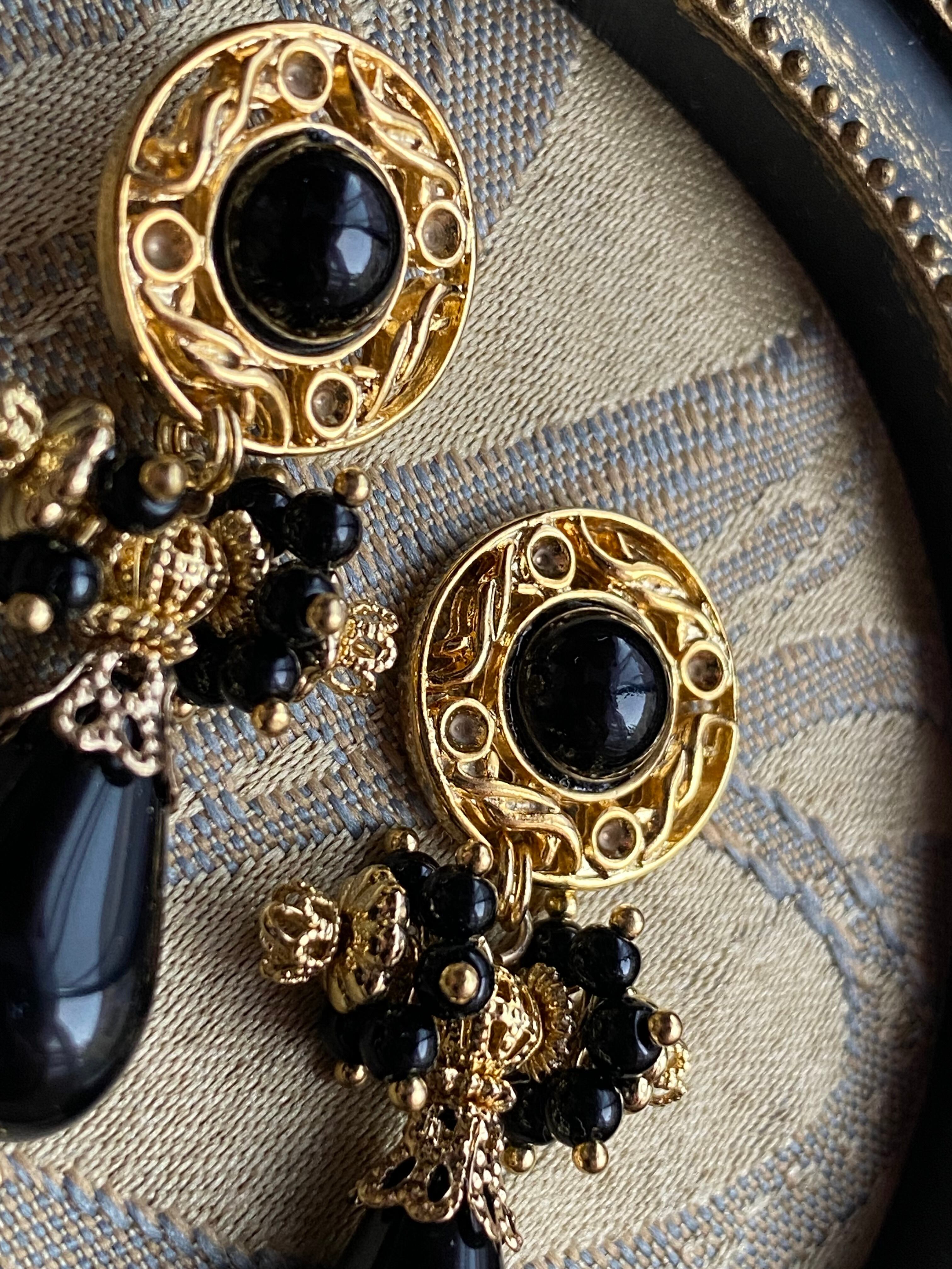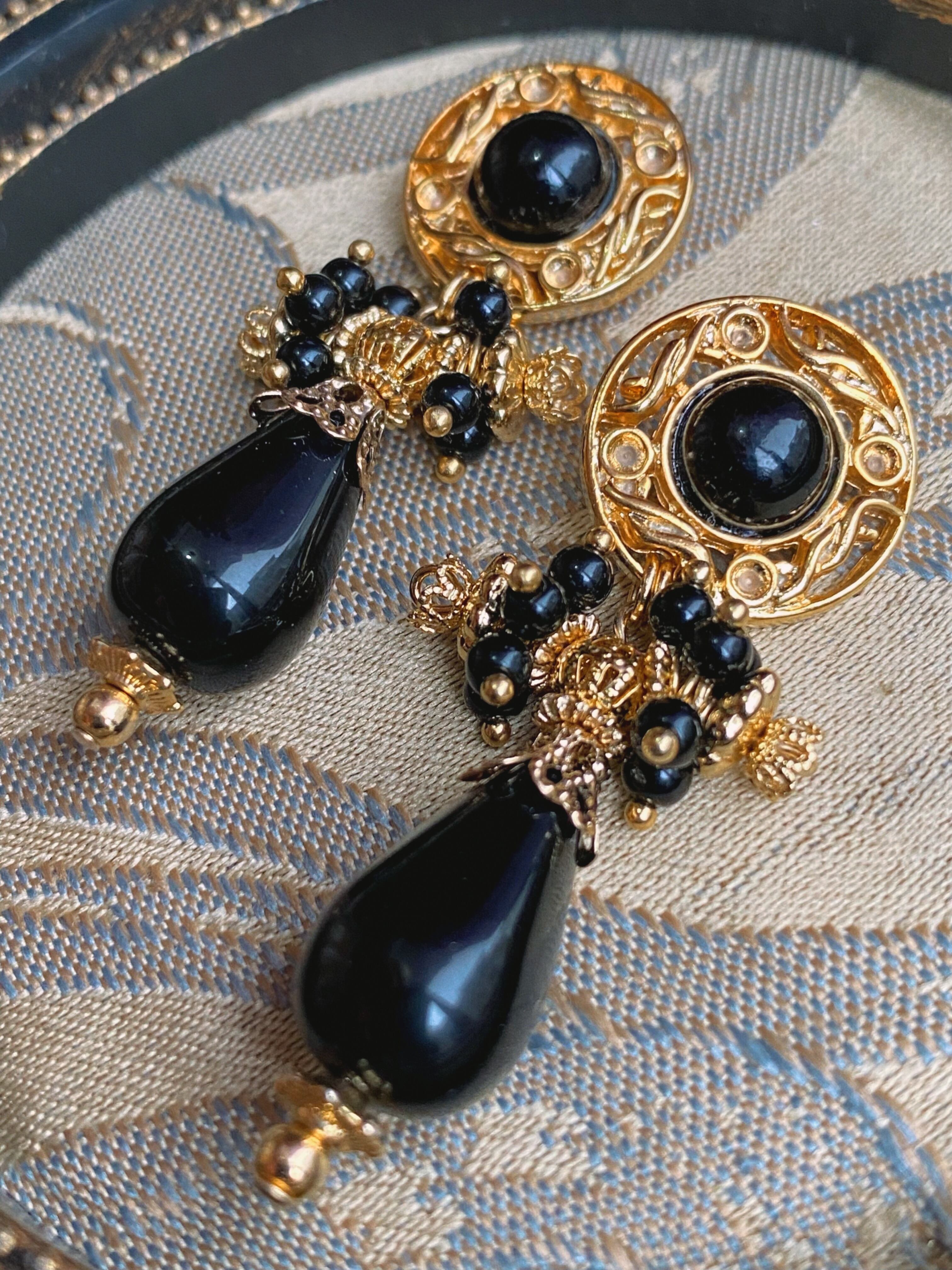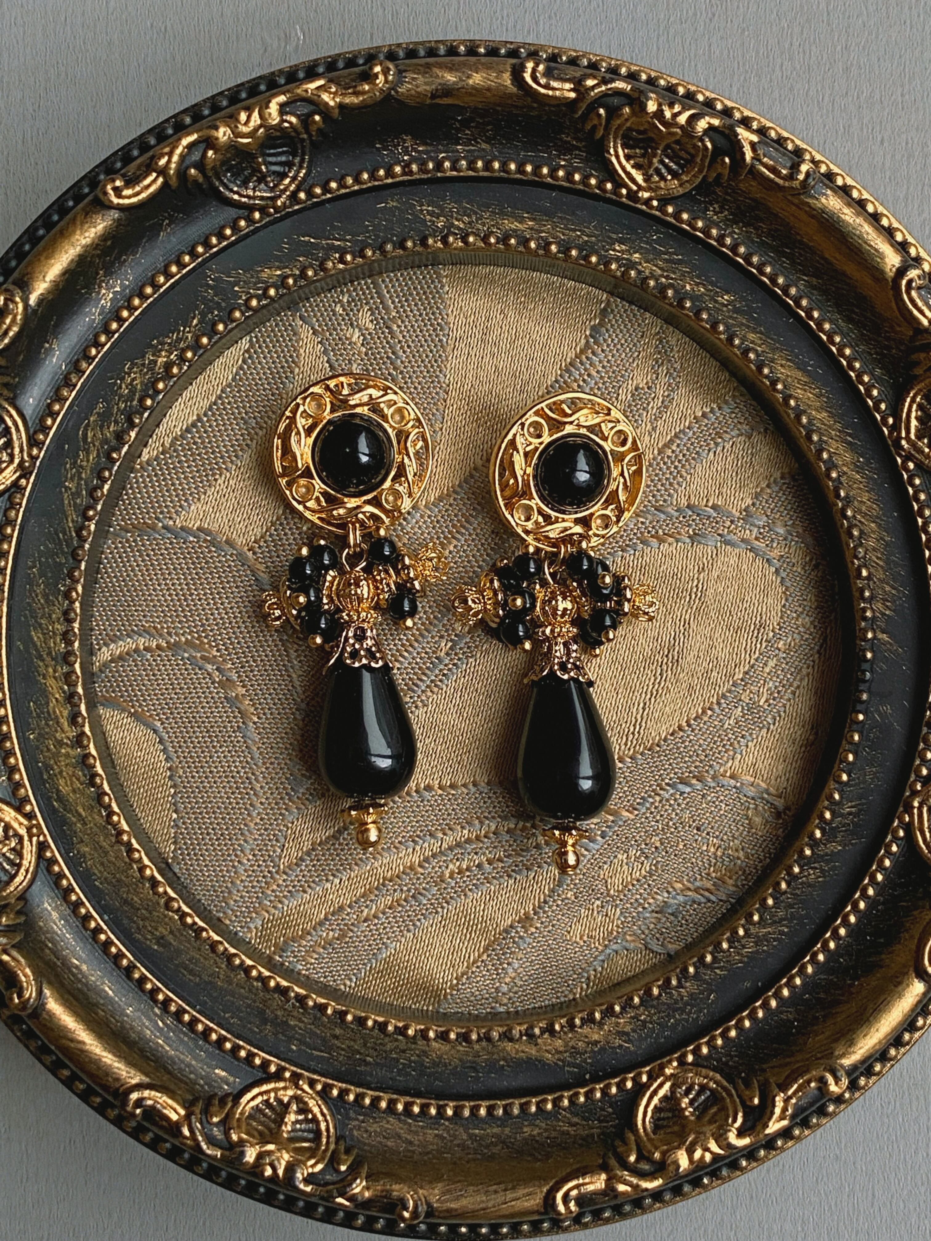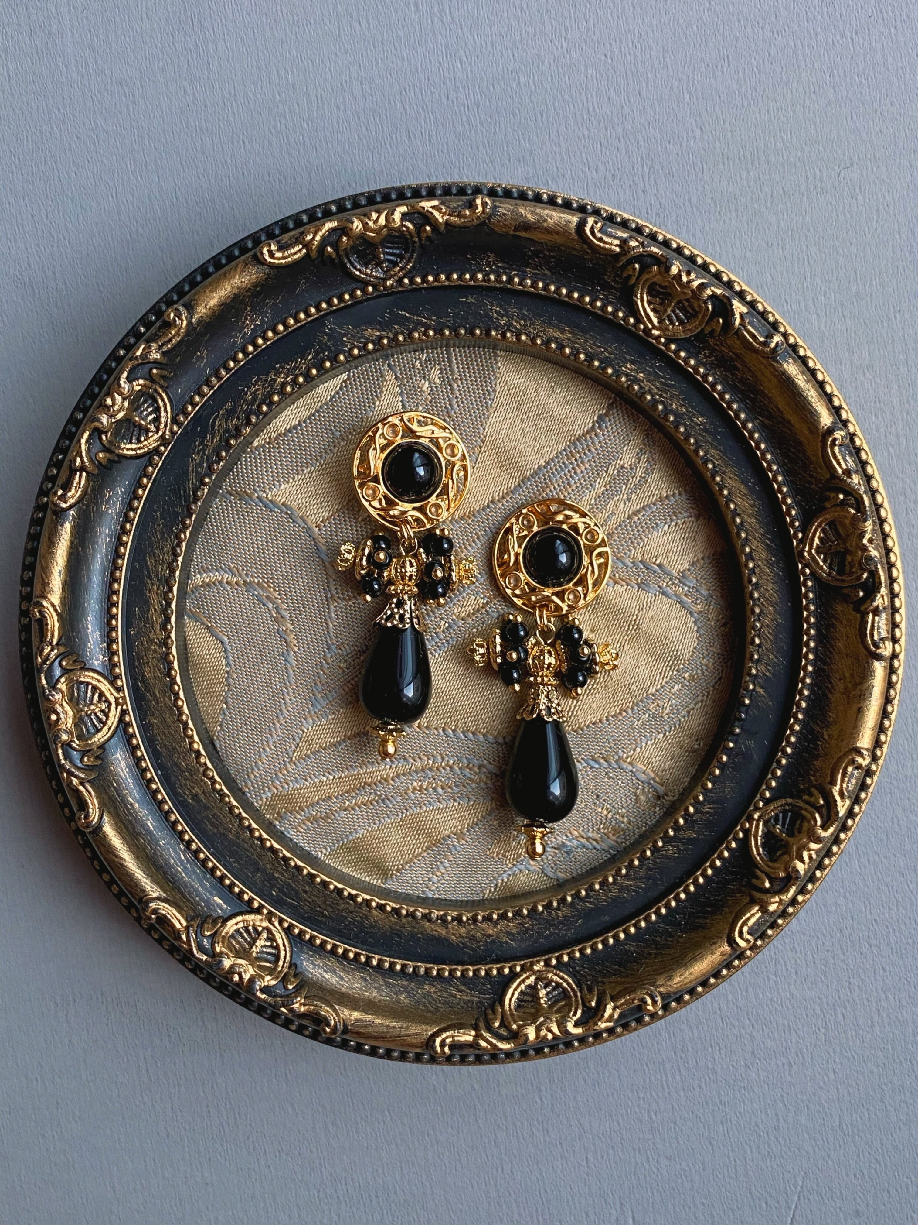 装飾的なメタルパーツを合わせてボリューム感のある存在感抜群のイヤーアクセサリーに。ボタンから下のモチーフ全体が揺れ、小粒なデッドストックビースが揺れ、耳元をデコラティブに彩ります。