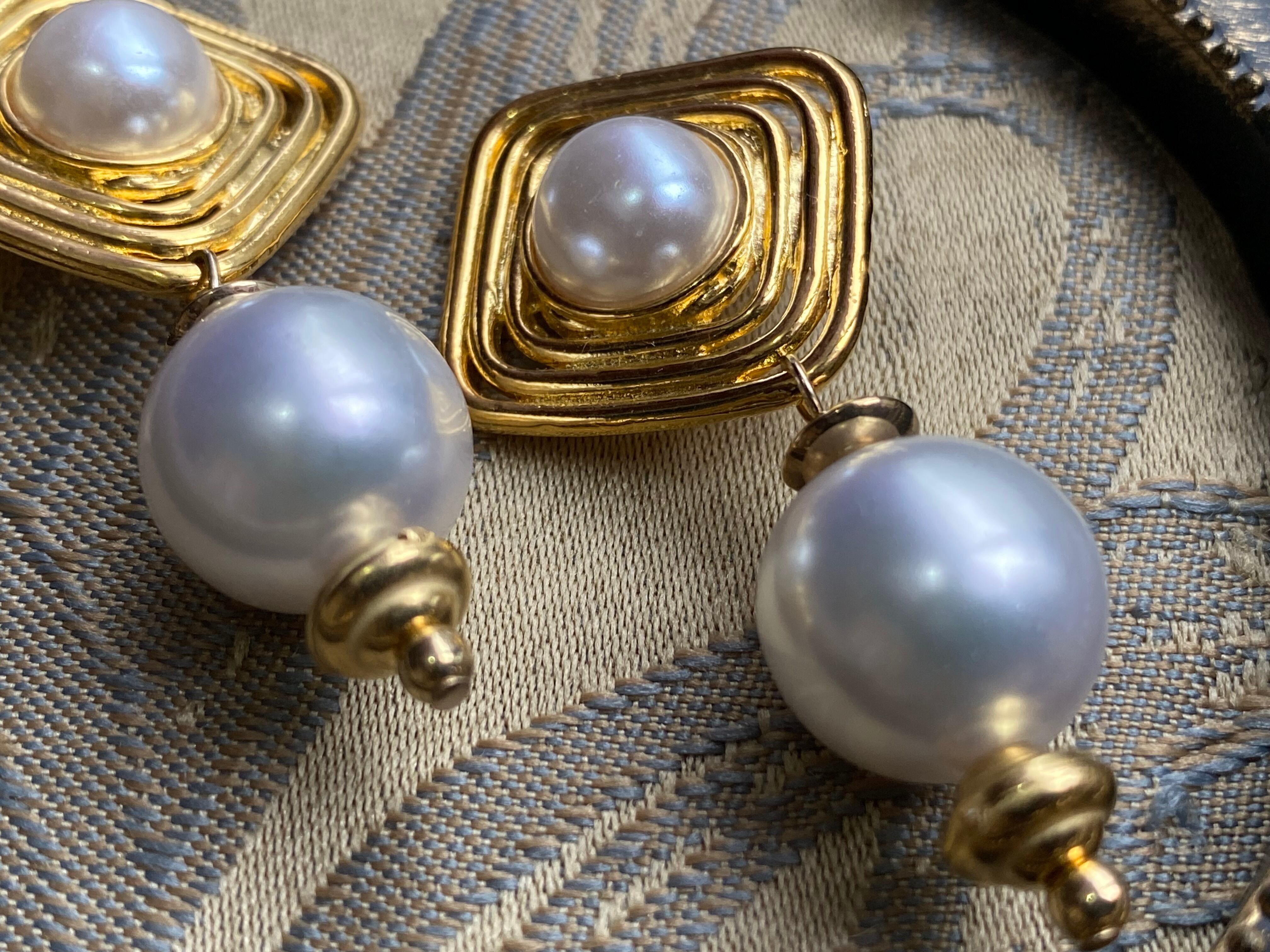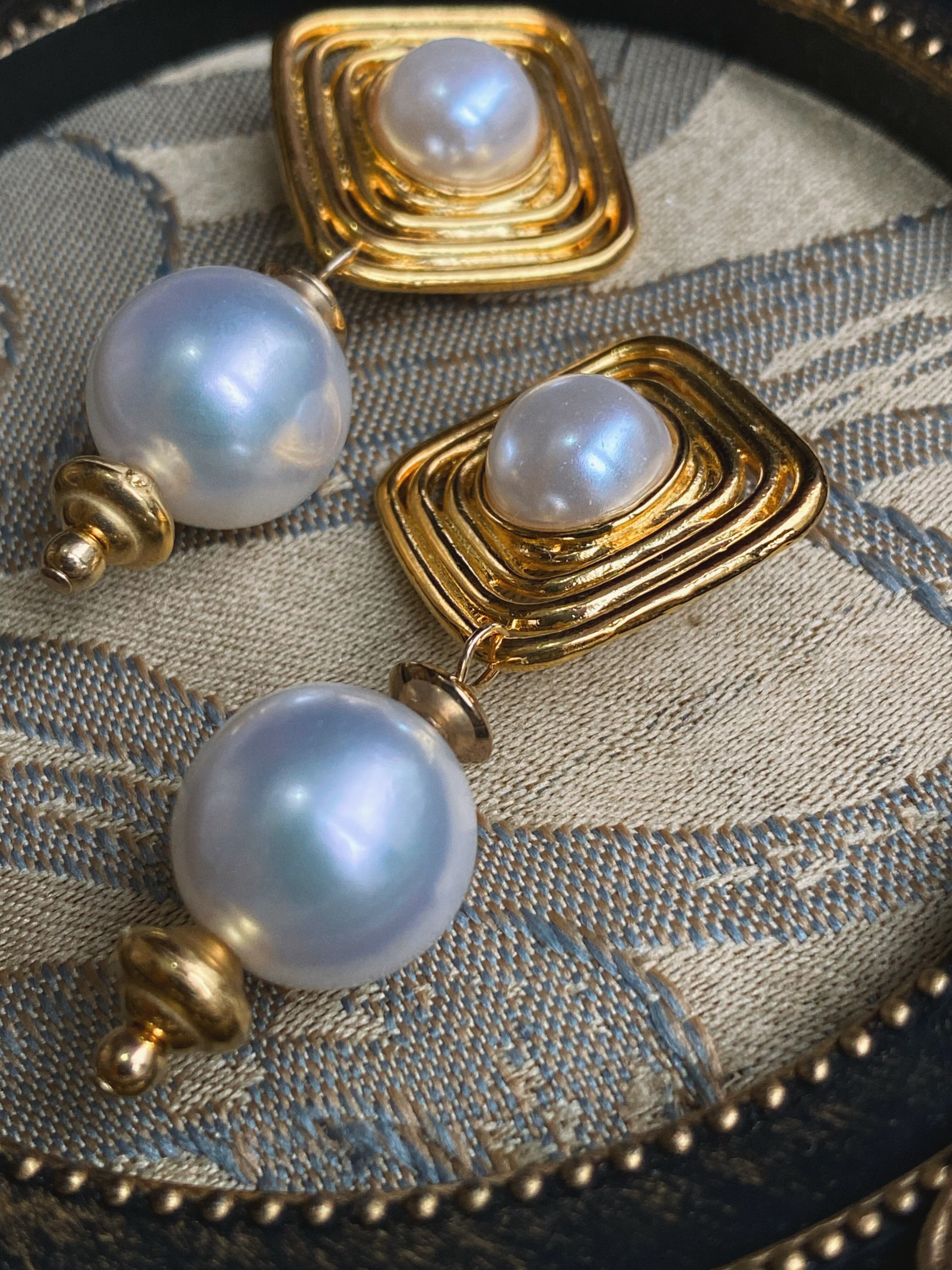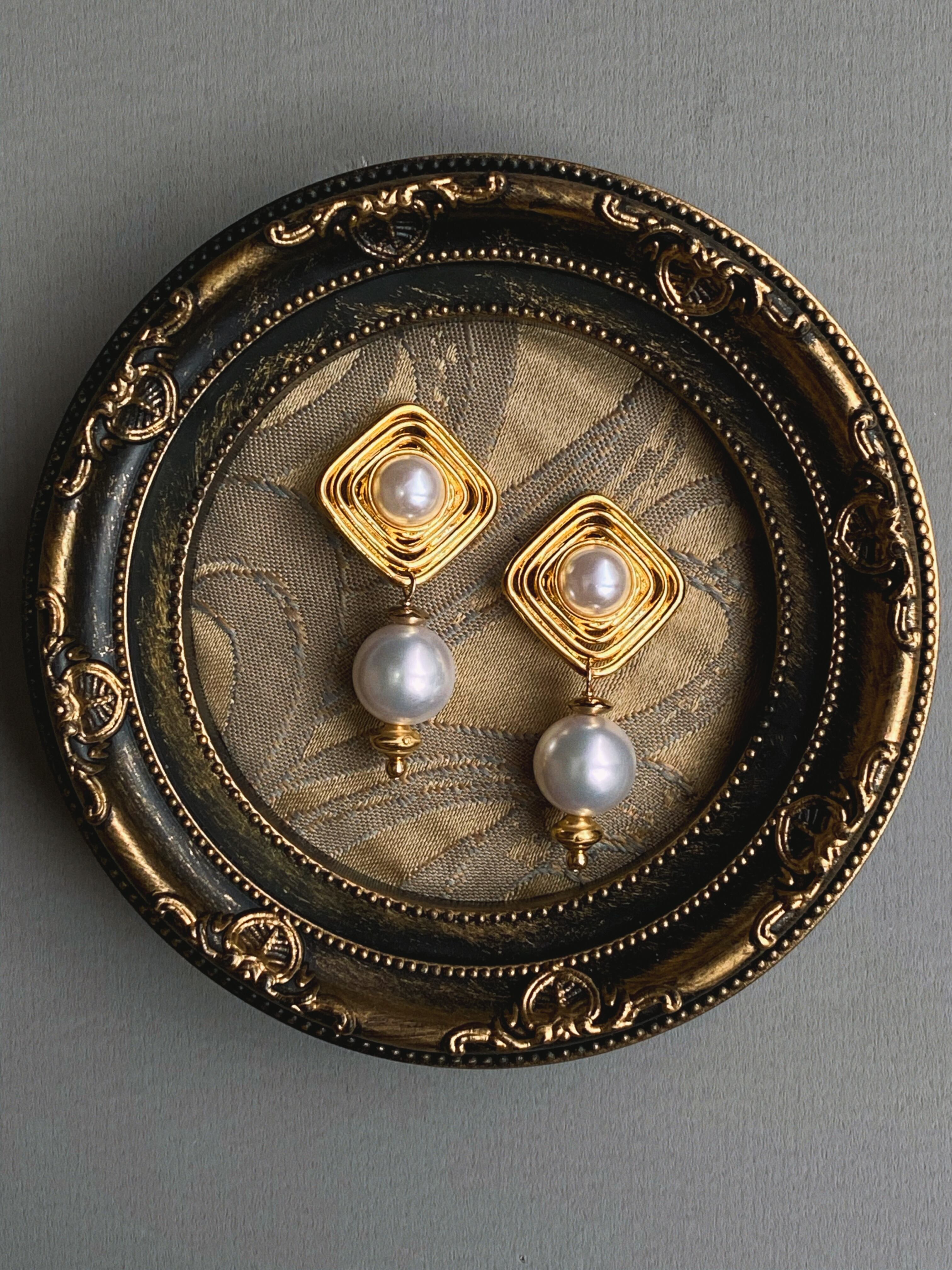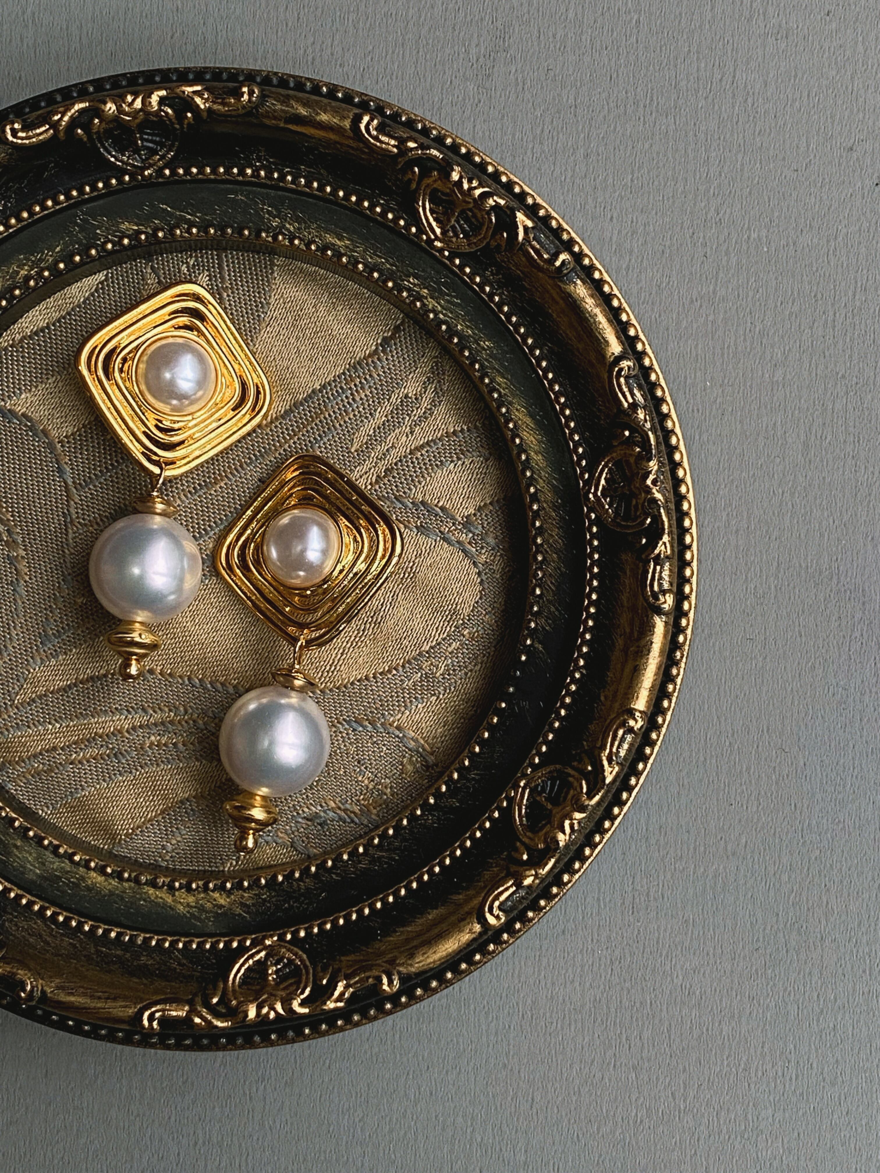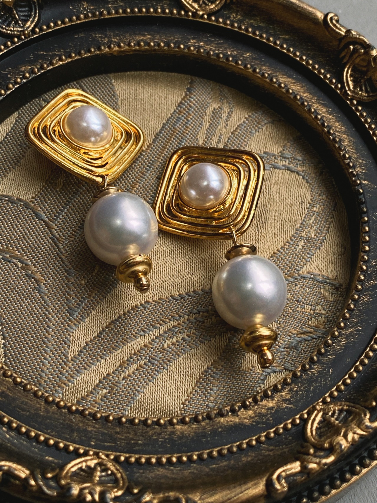 大振りなボタンパーツに合わせてヴィンテージライクな雰囲気に仕上げたイヤーアクセサリー