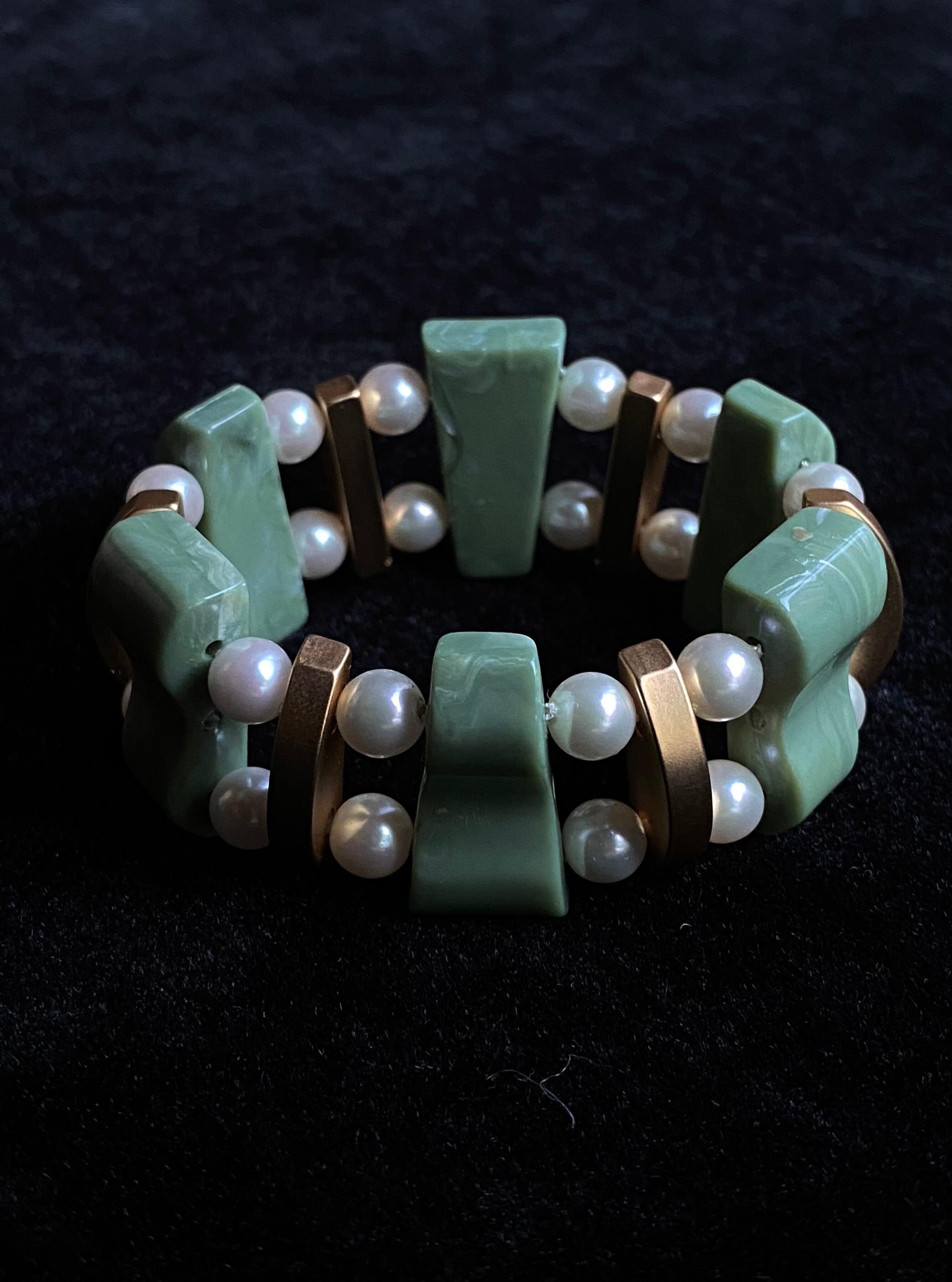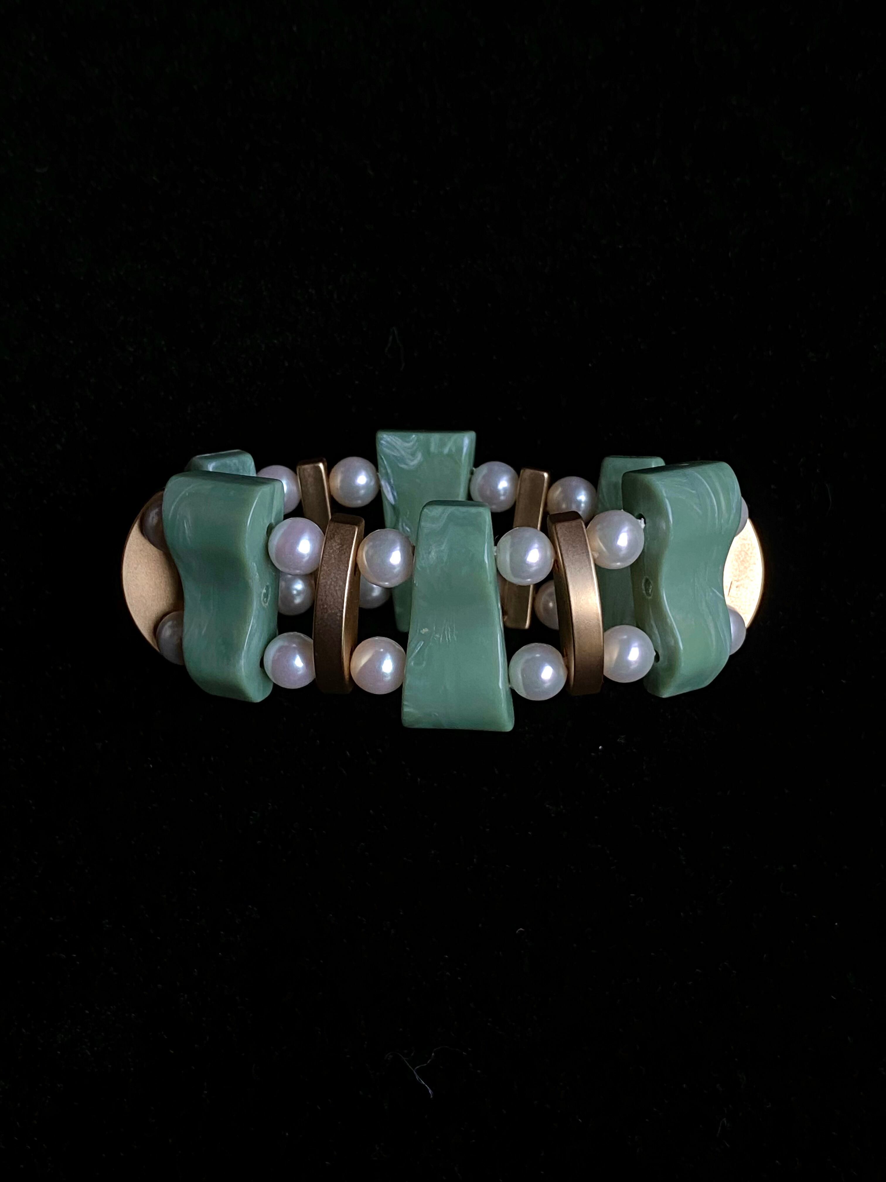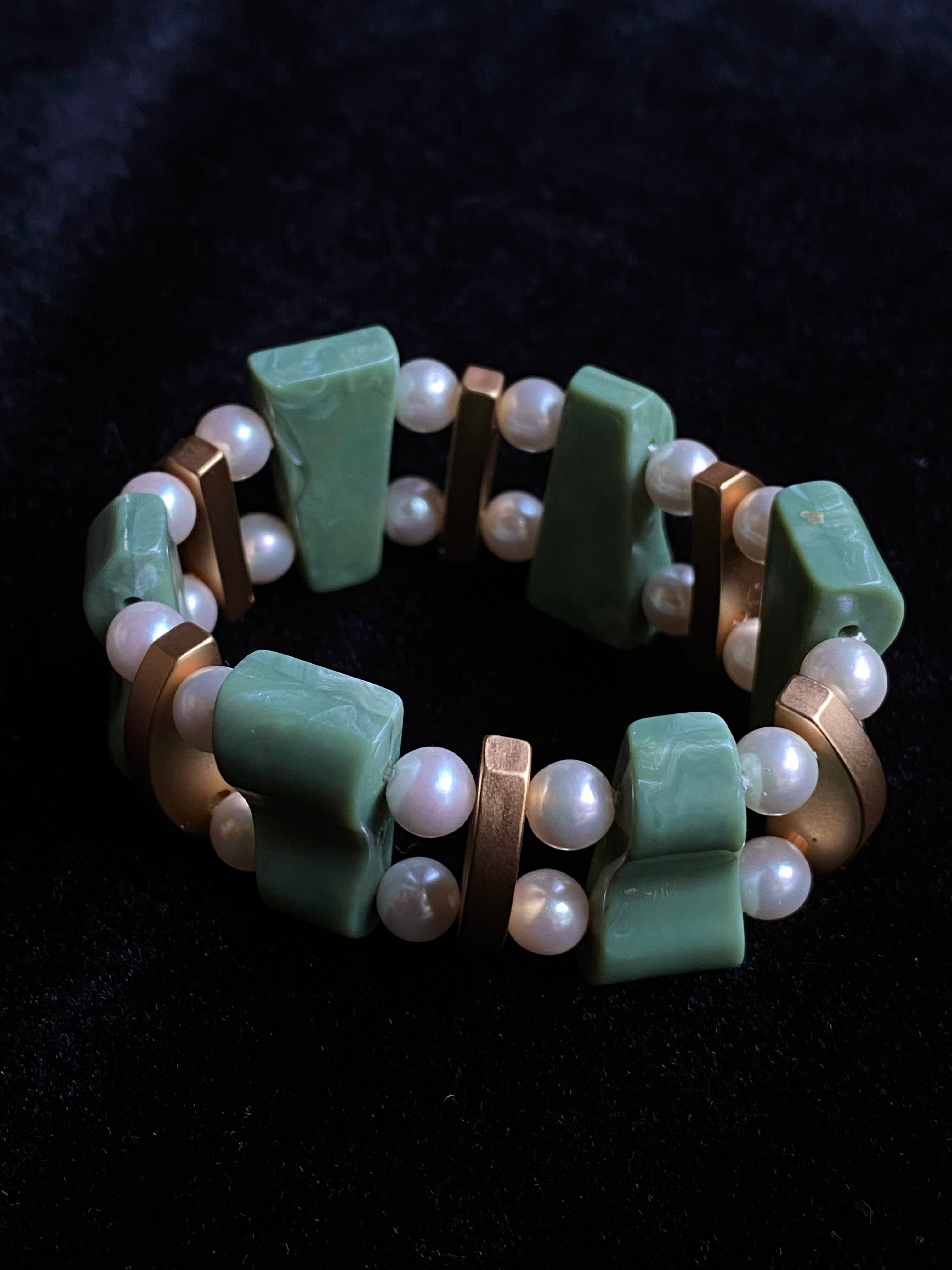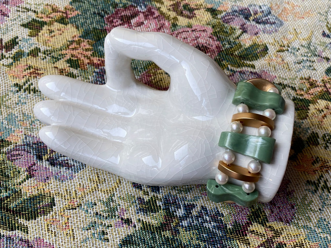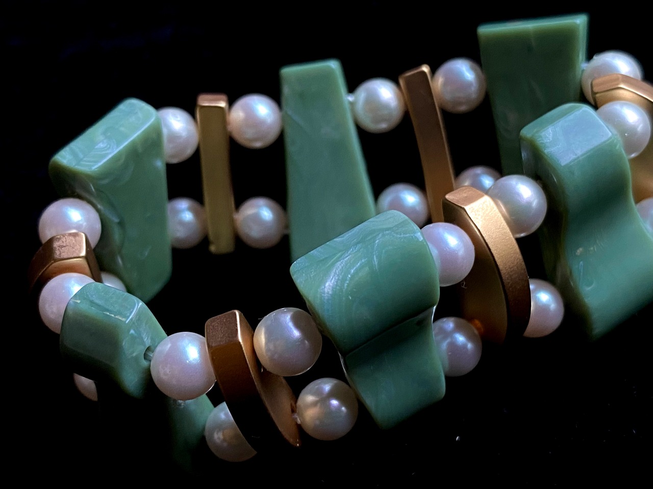 着脱が楽でデザイン性が高いゴムブレスレットをデザインしたく、制作した商品です。今後、入手困難とみられるパーツを使用しておりますため、一点のみの販売です。