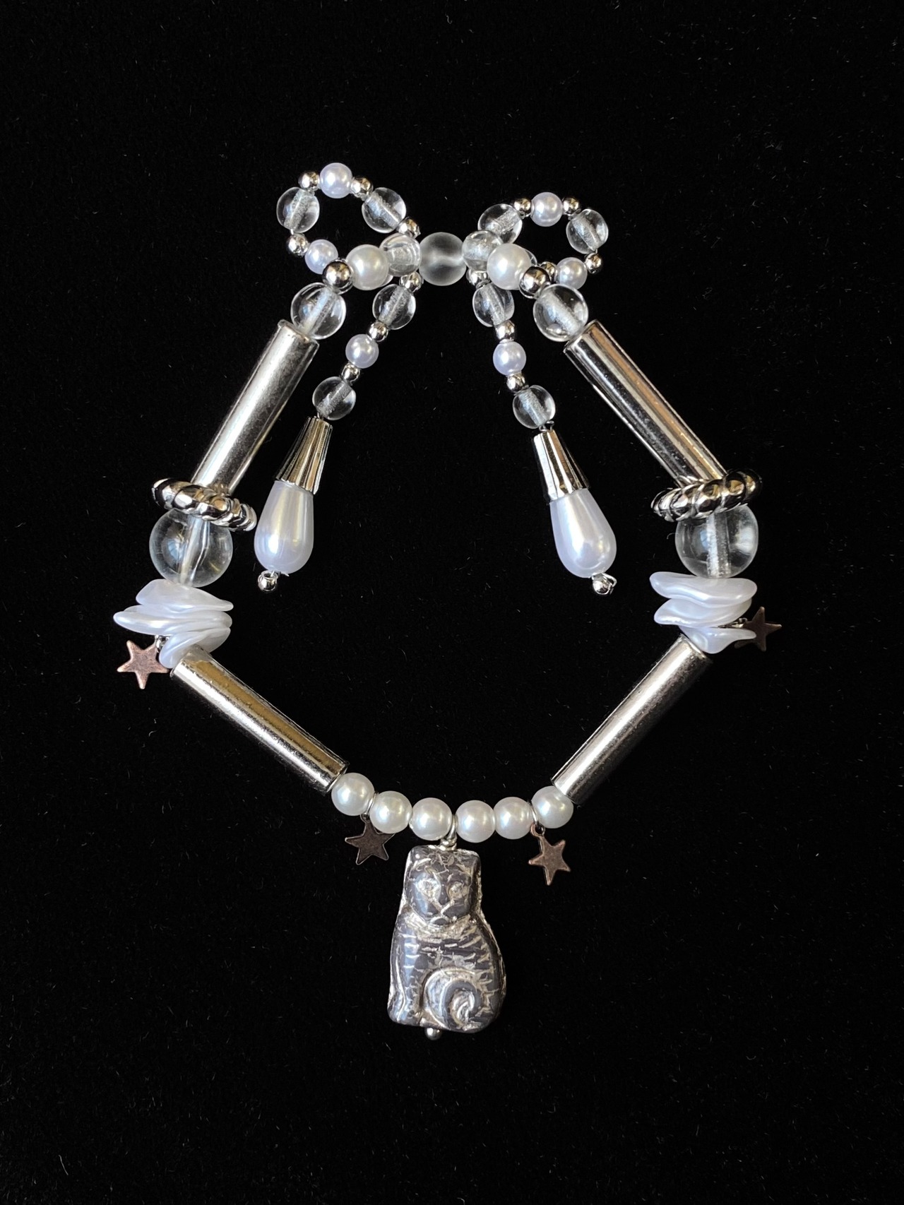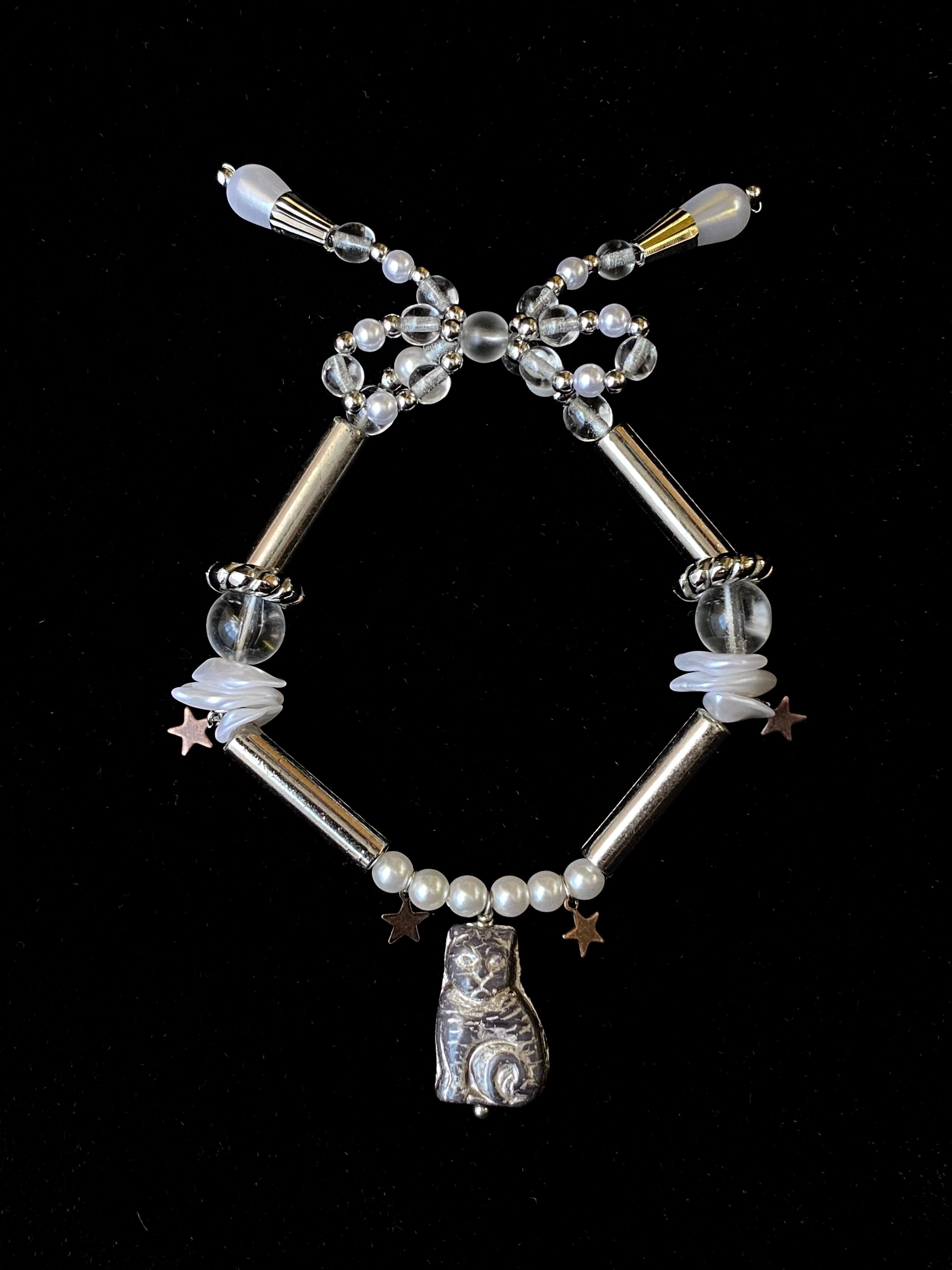 猫のパーツとリボンのどちらをメインにしても使用できるリバーシブルなデザインのブレスレット。